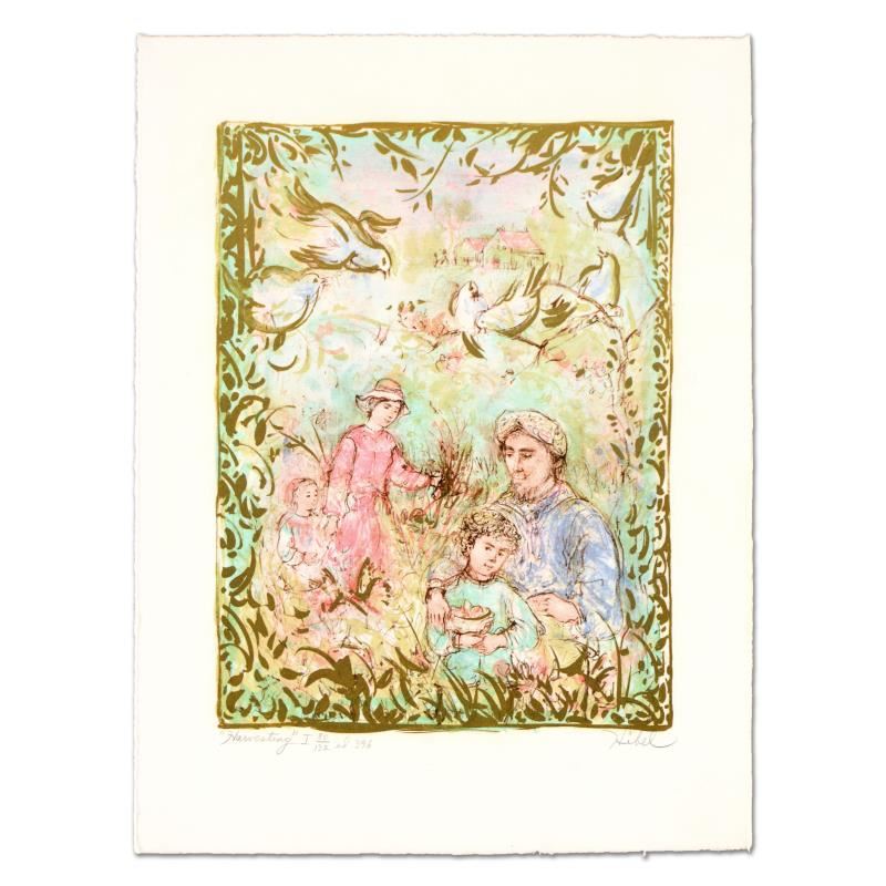 "The Family Suite Edition I" is a 4-piece set of limited edition lithographs on paper celebrating the beauty of family in all of its four stages: "Sowing - The Promise", "Ripening - The Fulfillment", "Harvesting - The Future", and "Through the Generations". Each piece is numbered and hand signed by Edna Hibel (1917-2014). Includes Certificate of Authenticity. Measures approx. 14" x 18" (box); 12" x 16" (each lithograph).