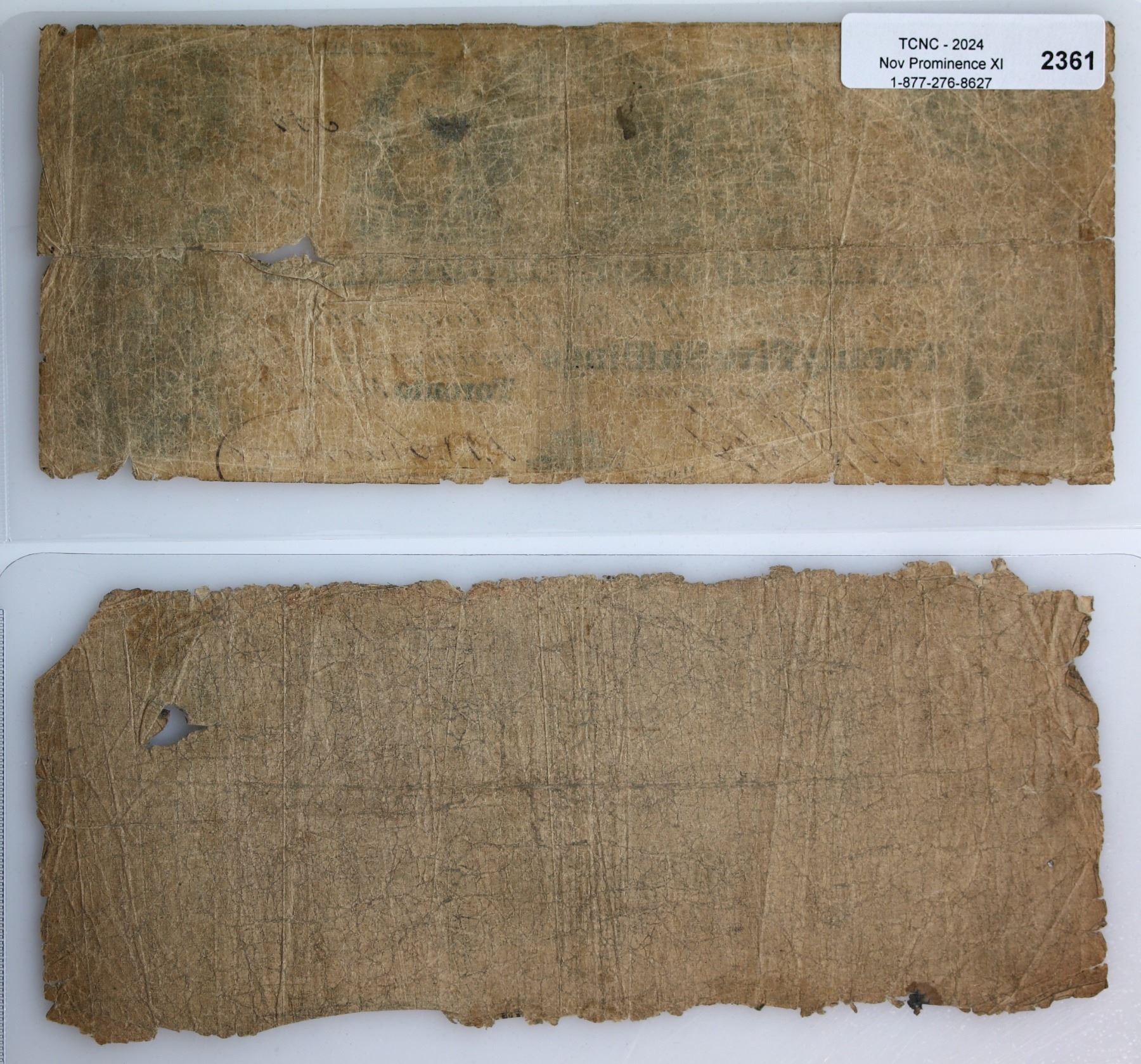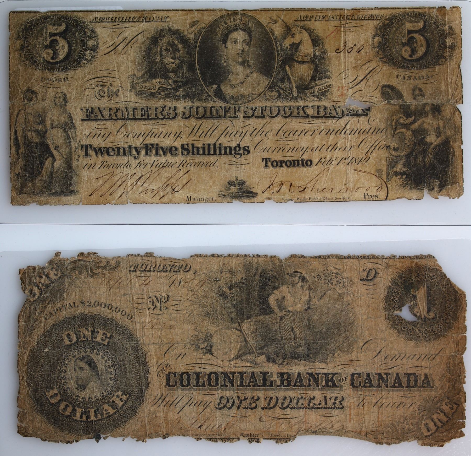 The Farmer'S Joint Stock Bank 1849 $5 #350 CH-280-14-12-06 & The Colonial Bank of Canada 1859 $1 CH-130-10-02-02. Lot of 2 notes Fair to G+ both examples w/internal and border major issues.