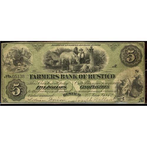 The Farmers Bank of Rustico 1872 $5 CH290-12-06 No.05138 CCCS VF-20. Only three examples are known and this is the nicest one by far. Others are in Good condition. Of the highest rarity! A museum piece! Worth a premium bid.