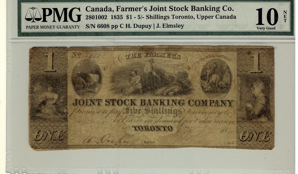 The Farmers Joint Stock Banking Co 1835 $1 #6608 CH-280-10-02 PMG VG10