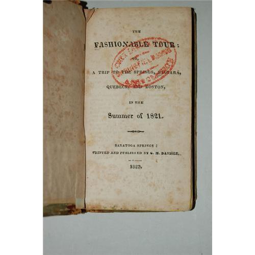 The Fashionable Tour: Or, A Trip to the Springs, Niagara, Quebeck and Boston, in the Summer of 1821. Saratoga Springs: G.M. Davison, 1822. First Edition. 24mo - over 5" - 5¾" tall. Hard Cover. Ex-Library. Good Condition. First U.S. Guide Book to a pleasure tour, with mention of the Erie Canal under construction (pg 92-93). SCARCE. 165pp bound in 1/2 leather & paper. Cover worn at edges/corners & upper backstrip, interior foxing. Front hinge starting, binding tight