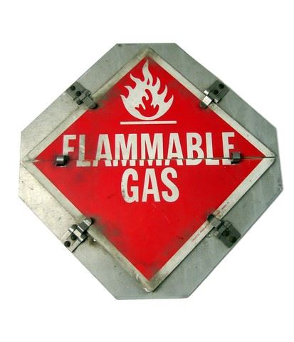 Metal red and silver "Flammable Gas" sign, from set decor of The Fast and the Furious: Tokyo Drift (2006) movie. Approx. 14" x 14".