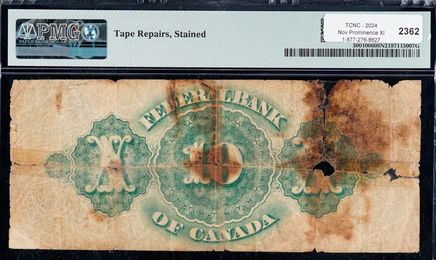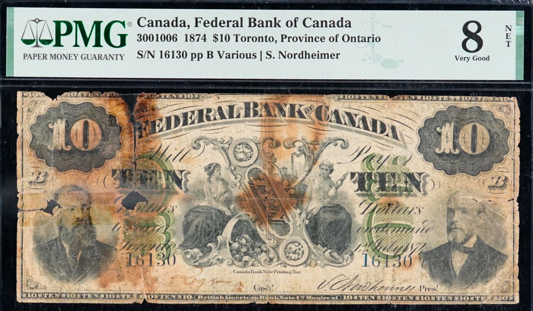 The Federal Bank of Canada 1874 $10 #16130 CH-300-10-06, PMG Very Good-8net. A decent example of this early type note.