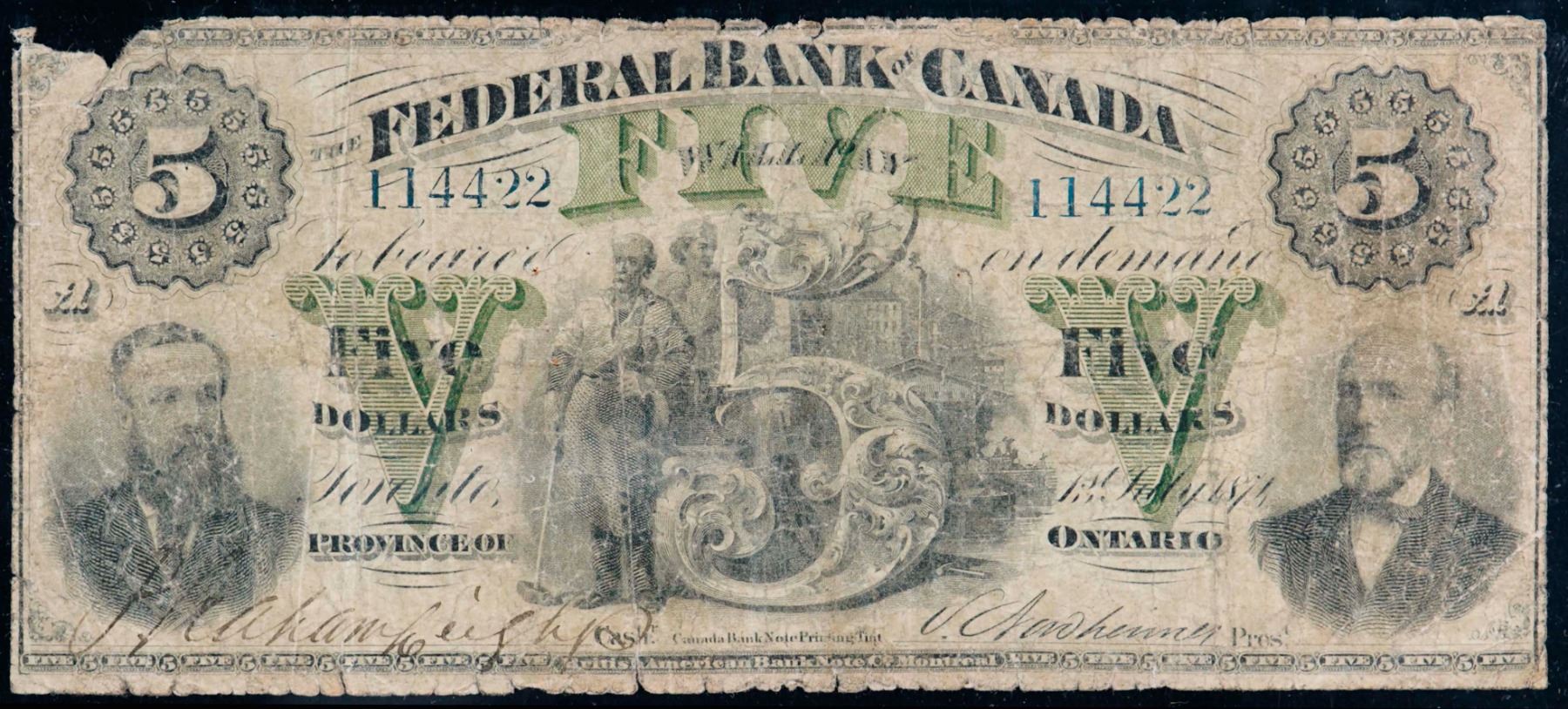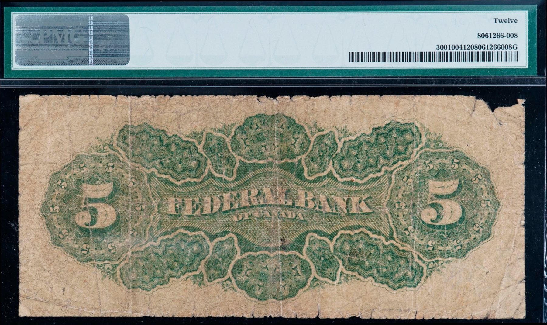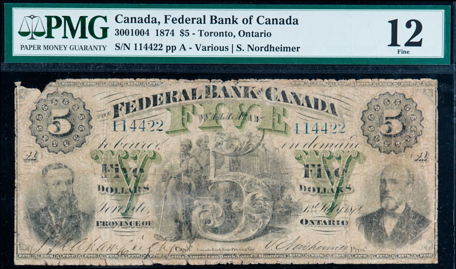 The Federal Bank of Canada 1874 $5 #114422 CH-300-10-04 PMG Fine-12
