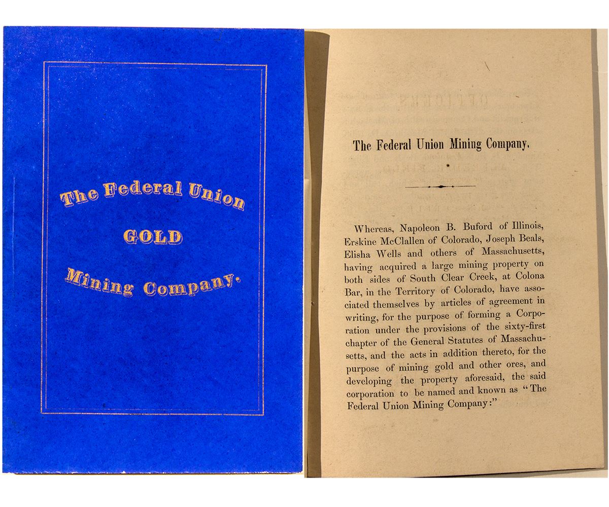 By-laws of the Federal Union Mining Company, Clear Creek County, Colorado, organized March 27, 1866. Capital stock $1000,000. Franklin Job Printing, Greenfield, 1866. Stitched in original printed deep blue wrappers, with wrapper title, 'The Federal Union Gold Mining Company,' lettered in gilt. (6.25" x 4.25") 11 pp. Near Fine. The President of this Massachusetts corporation, Alfred R. Field, was from Greenfield. Other officers were from Massachusetts and Rock Island, Illinois. One Director was from Colorado. The property was located "on both sides of South Clear Creek, at Colona Bar, in the Territory of Colorado." The corporation was organized "for the purpose of mining gold and other ores," during the enthusiasms of the Colorado Gold Rush. The bylaws prescribe a form stock certificate. The Federal Union Mining Company (F. U. M. C.) was organized by a group of Eastern investors including A.W. Hoyt, a civil engineer, Elisha Wells, a Massachusetts businessman, and General Napoleon Bonaparte Buford, at the end of the Civil War. In 1865, Hoyt sent Buford, a Union general who had been prominent in the Tennessee Campaigns, to visit the mining property of Jeb and Erskine McClellan in Clear Creek County, Colorado, seven miles from Black Hawk. Hoyt instructed Buford to check out the mines’ "working value" and get the McClellan brothers to sell their claims. Buford visited Colorado and returned East in late 1865 with bond to pay for the claim. In 1866 the company was formally organized. Arthur Field was elected President and Elisha Wells was to serve as Treasurer-Secretary. A sufficient number of Eastern investors were solicited to raise enough capital to send Buford back to Colorado in the spring of 1866 as superintendent of the mines. He took with him a group of men to work in the mines and a trainload of supplies in April 1866. In Clear Creek County, Buford served as superintendent until December 1866. Then he decided to return to his home in Rock Island, Illinois for the winter. In the spring of 1867, the Board of Directors, displeased with Buford’s management of the claim as they had no evidence of profits, dismissed Buford as superintendent. Buford later became a special commissioner to inspect the newly completed Union Pacific Railroad. He spent his last years in Chicago and died there in 1883.