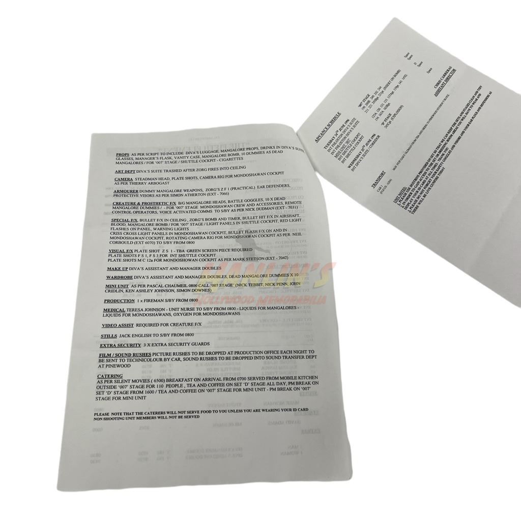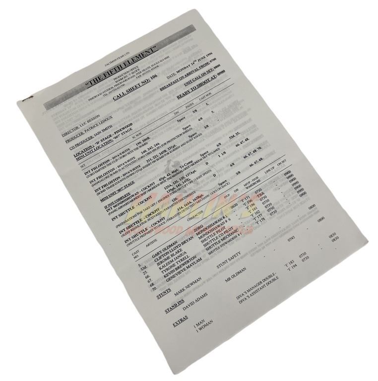 Original production used callsheet used in the production of the Luc Besson science fiction action film 'The Fifth Element' (1997), set in the 23rd century, the film's central plot involves the survival of planet Earth, which becomes the responsibility of Korben Dallas (Willis), a taxicab driver and former special forces major, after a young woman (Jovovich) falls into his cab. To accomplish this, Dallas joins forces with her to recover four mystical stones essential for the defence of Earth against the impending attack of a malevolent cosmic entity.
