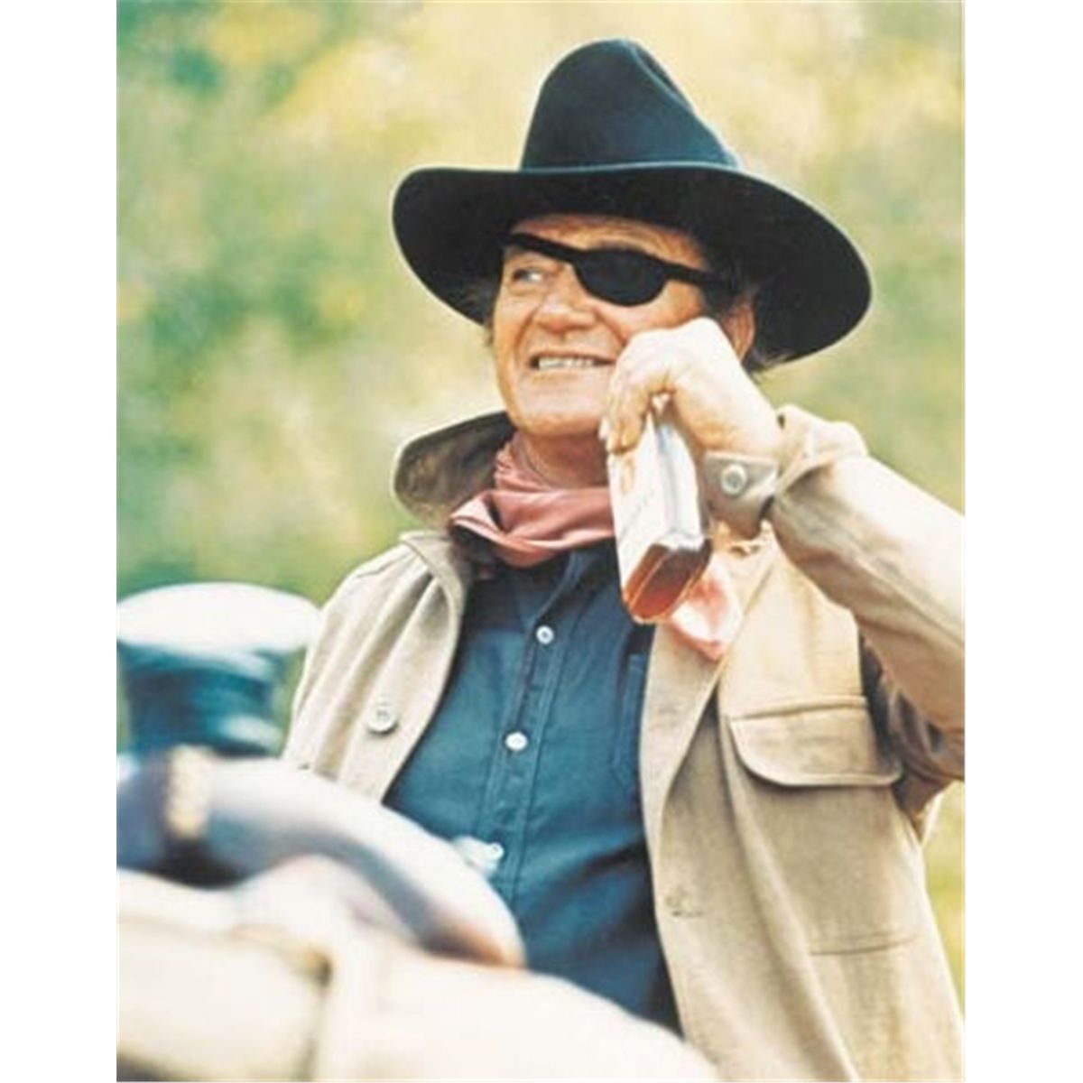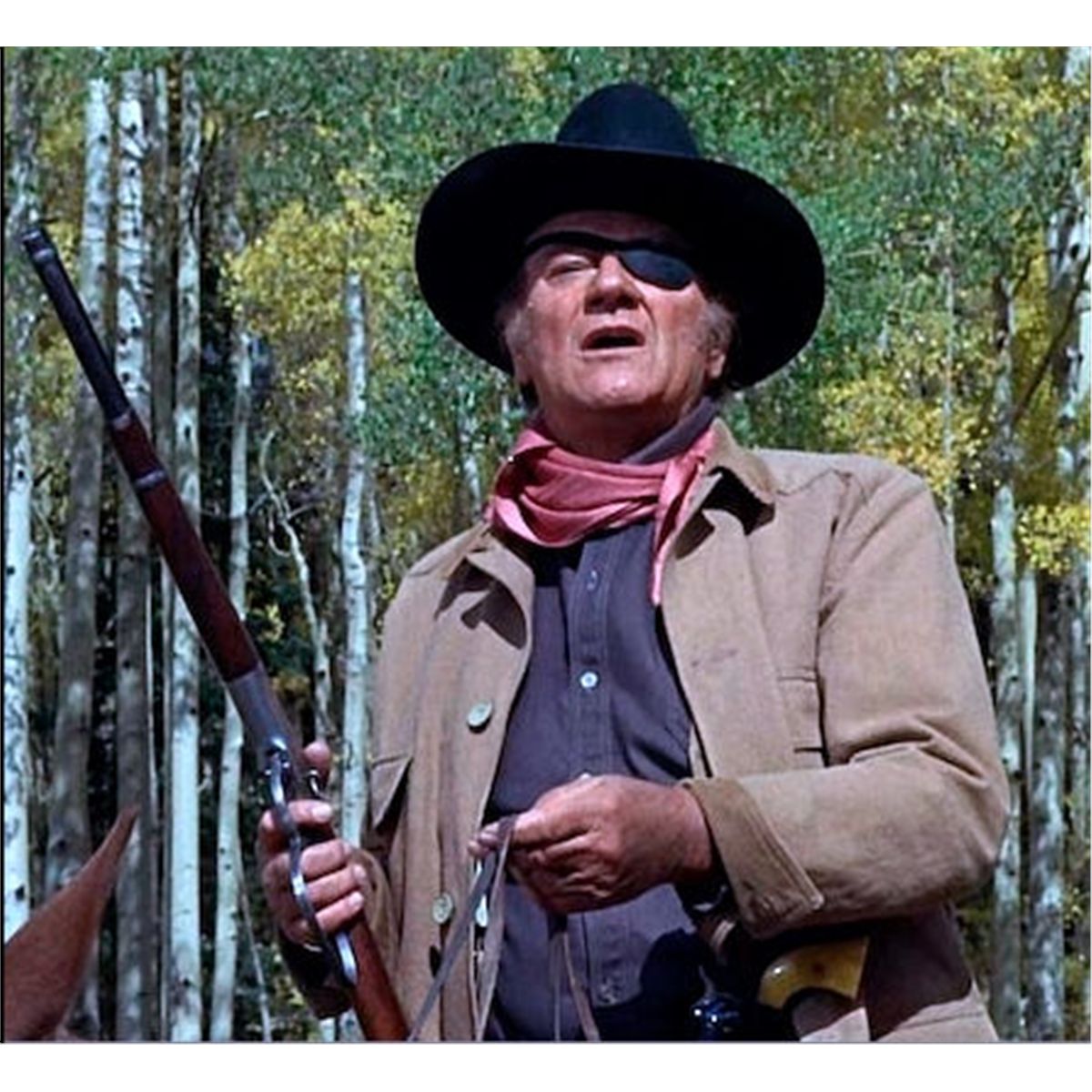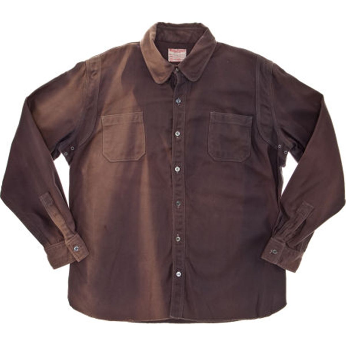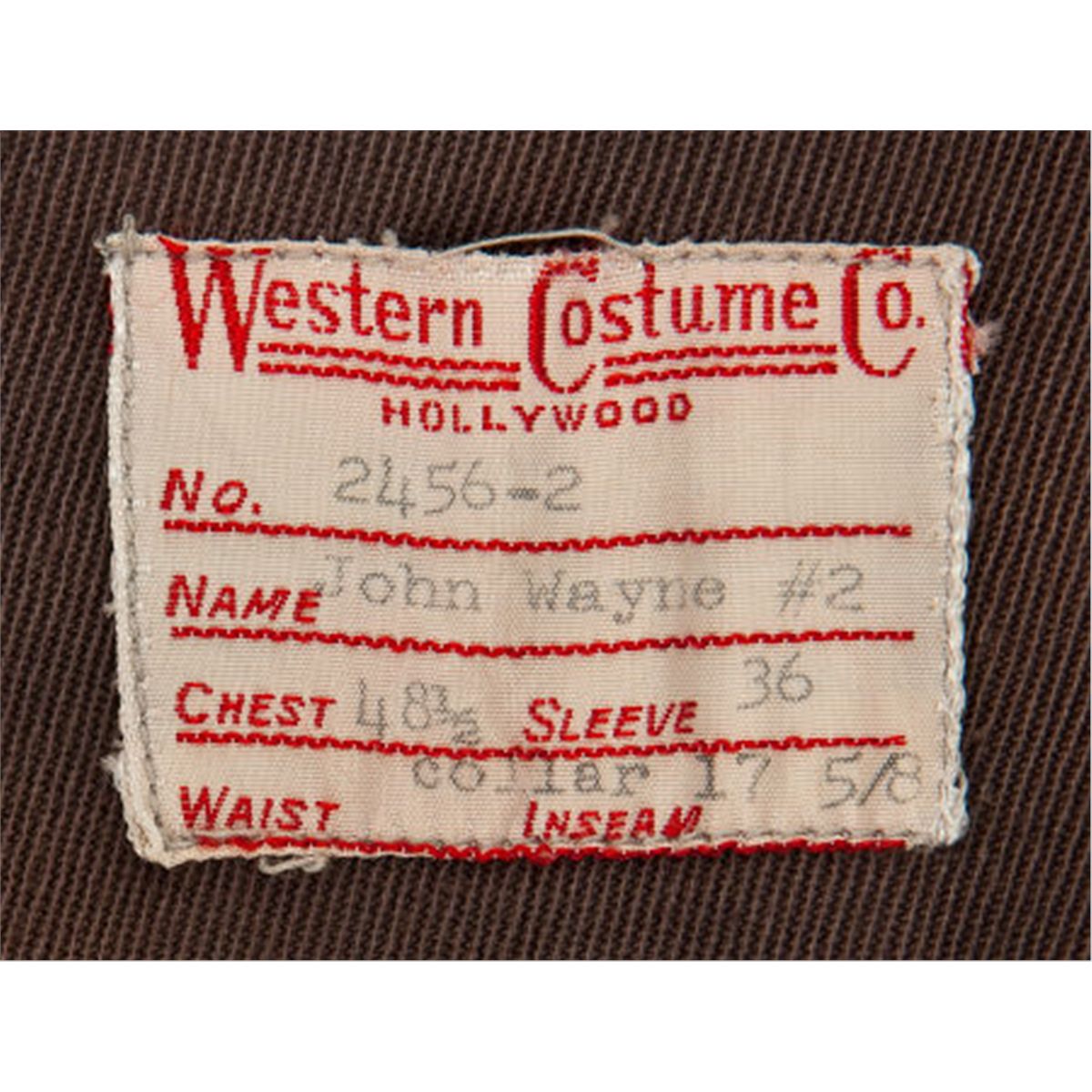 The 'Fill Your Hand' Shirt from "True Grit." Paramount, 1969. Made of faded navy blue/purplish cotton with white stitching, long sleeves, two breast pockets, ventilation holes under arms and on back, Western Costume Co. label reads "No. 2456-2 / John Wayne #2 / Chest 48 1/2 / Sleeve 36 / Collar 17 5/8;" worn by Wayne in the famous shoot-out scene where he yells to Robert Duvall [as "Ned Pepper"], "Fill your hand, you son of a bitch;" also worn in other scenes. (Please note shirt has faded in an uneven pattern where parts of it are lighter than others.)
