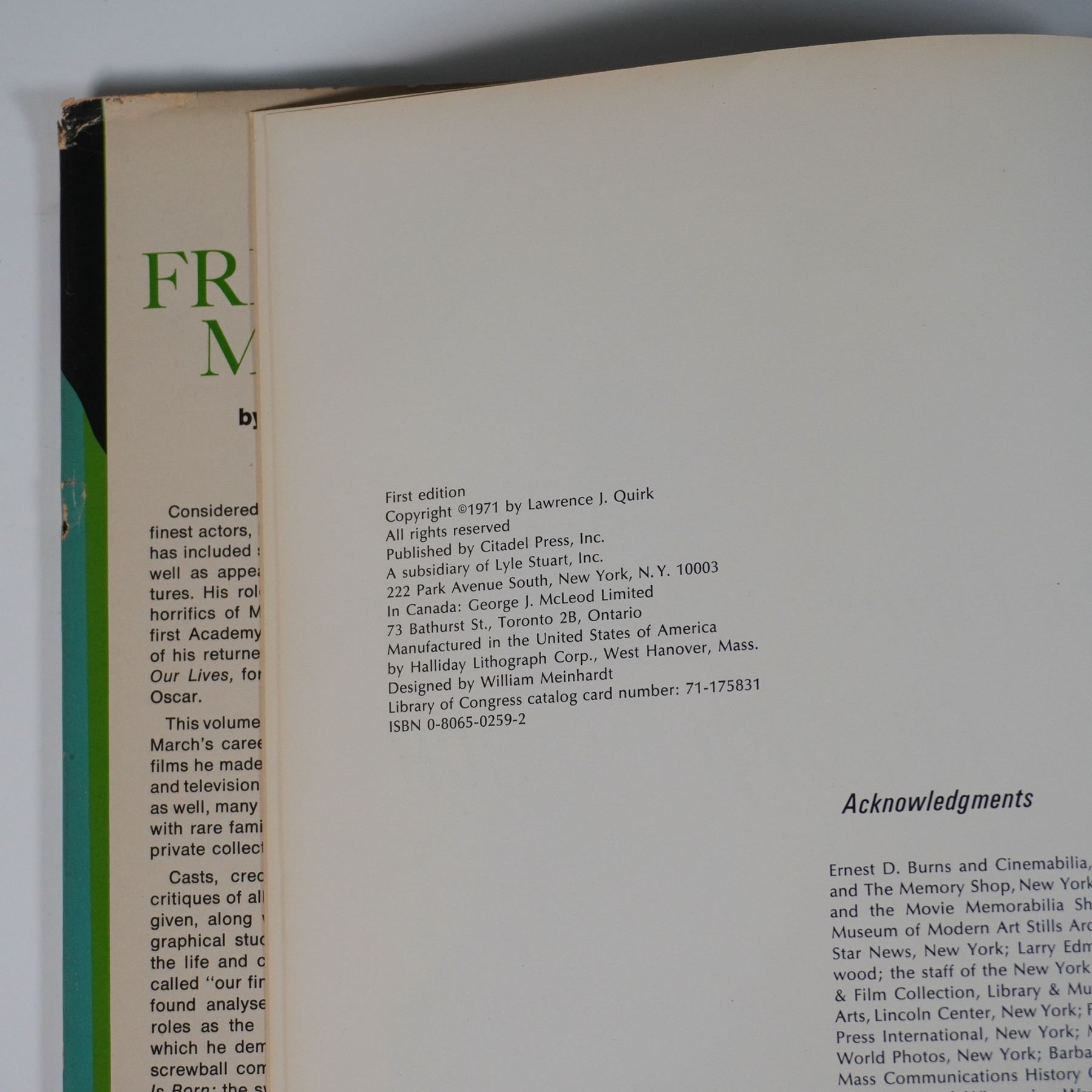 A first edition of The Films of Fredric March by Lawrence J. Quirk, published in 1971 by Citadel Press, Inc. This book provides a detailed retrospective of the acclaimed Hollywood actor Fredric March, known for his versatile performances in classic films such as Dr. Jekyll and Mr. Hyde and The Best Years of Our Lives. Featuring rare photographs, film critiques, and behind-the-scenes insights, this volume is a must-have for collectors of classic cinema history. Hardcover with a striking dust jacket design, measuring 8.75"L x 1"W x 11.5"H.