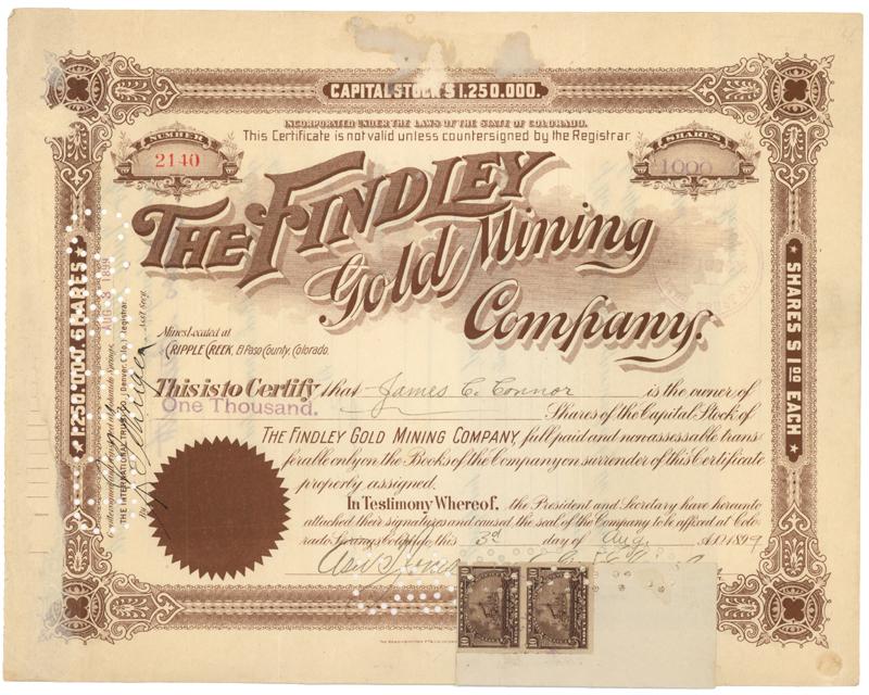 1899, Colorado. Stock certificate for 1000 shares. Brown. Two adhesive 10 cent stamps attached at bottom. Some paper loss at top center and left border from stub removal. Perf cancelled and good.