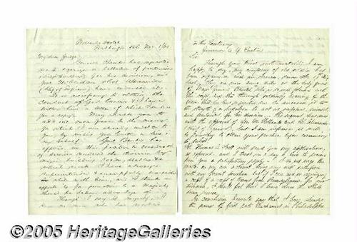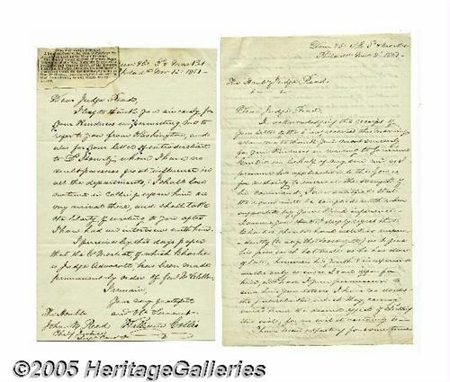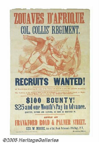 <B>The Finest Civil War Recruiting Poster We Have Ever Handled</B></I> Large 24" x 38" poster with magnificent red, white and blue graphics, with more than a third of the area taken up by a scene of a Zouave dispatching a Confederate soldier with his sword in the heat of battle! The "Zouaves D'Afrique" was a famous Civil War unit whose distinguished history is well documented. Charles H. T. Collis came from a well-connected Philadelphia family, but nonetheless initially volunteered for the army as a private with the 18th Pennsylvania Regiment in 1861. He quickly distinguished himself and was promoted to Sgt. Major. Collis mustered out in August to set about forming an independent company, to be known as the Zouaves D'Afrique. The name was inspired by their distinctive, Moroccan-style uniforms, designed after those of the famous French Zouaves who originated in North Africa. The new unit was intended to be the personal bodyguard of General Nathaniel Banks, and it took only three days to fill the ranks. In addition to their colorful uniform, they were equipped with new Enfield rifles and enormous sword bayonets, and doubtless made quite a stir. The choice of uniforms may have been a blatant attempt to gain the favorable notice of General George McClellan, who had witnessed the French Zouves in action as an observer of the Crimean War, and who fell in love with their colorful uniforms. The 23 year old Collis apparently had boundless ambition: this poster is accompanied by the original letter written to Pennsylvania Governor Andrew Curtin on November 1, 1861 (less than three months after forming his unit), asking for Curtin's approval to seek further enlistments to increase his command to battalion strength, a proposal he states has the endorsement of General McClellan. On the same date he writes in another letter, included with this lot, to a Judge Read, Chief Justice of the Pennsylvania Supreme Court and apparently a powerful patron and sponsor. He tells Read that General Banks has requested that he form this new unit, and repeats the claim made to Curtin that it was approved by McClellan. He asks Read to send a note in support of the idea to Curtin. Also included are a November 13 letter from Collis' mother thanking Read for his support of her son's request, and a November 8 letter from his father, William Collis, along similar lines (although apologizing for his son's rather pushy behavior, which he attributes to his "youth and inexperience"). Constituted as the 114th Pennsylvania Regiment, the Zouave unit founded by Collis distinguished itself throughout the war, seeing action at Fredericksburg, Chancellorsville, Gettysburg, Petersburg, and several other lesser battles and skirmishes. Charles Collis himself won the Congressional Medal of Honor for leading a "desperate charge" at Fredericksburg, and was promoted to the rank of Brevet Major General. The important history of the "Zouaves D'Afrique," along with the three fascinating and significant personal letters about the machinations by which the unit was formed, combine with the graphic quality of this recruiting poster to make it an item of the highest significance. The poster is in beautiful condition, with only the slightest roughness along the top edge. Three fine horizontal creases are original fold lines. A prize worthy of the most sophisticated Civil War collector. Lot:251