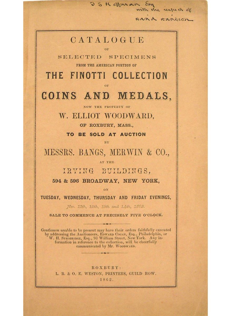 Woodward, W. Elliot. CATALOGUE OF SELECTED SPECIMENS FROM THE AMERICAN PORTION OF THE FINOTTI COLLECTION OF COINS AND MEDALS, NOW THE PROPERTY OF W. ELLIOT WOODWARD, OF ROXBURY, MASS. New York: Bangs, Nov. 11-14, 1862. 8vo, original printed wraps. 88 pages; 1908 lots. Fine. Woodward's 1st Semi-Annual Sale, an outstanding offering of American coins, medals and tokens. Important in many categories, including colonials, medals, tokens, Washingtonia, proof coins, large cents and half cents. Adams A: "1850ff proof sets. RR Washington. Proof 1823 1¢. Proof 1842 ?¢. Superb colonials including proof Clinton." Attinelli 26.