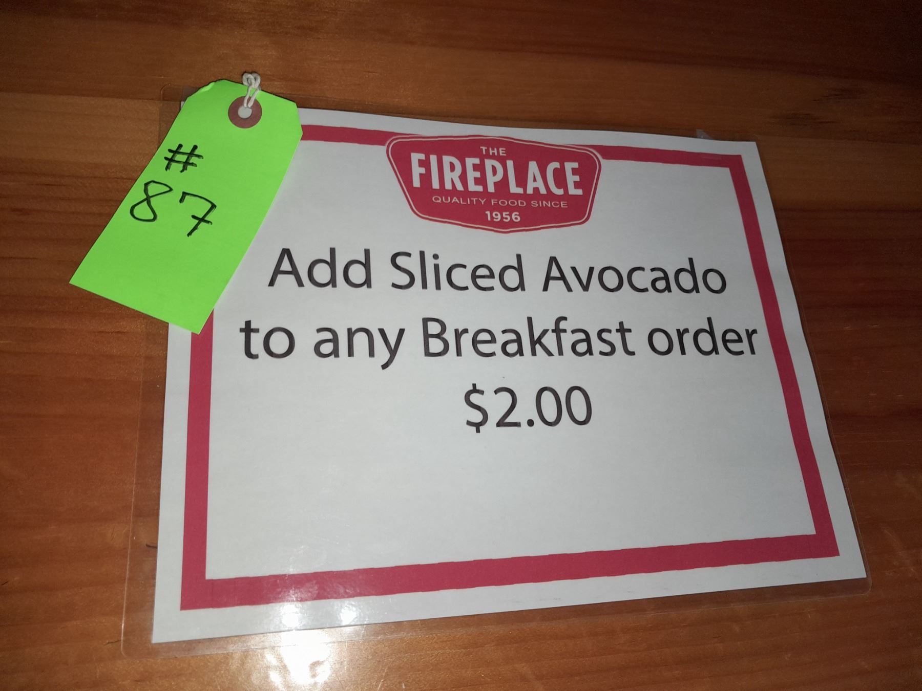 The Fireplace Restaurant - "Add Sliced Avocado To Any Breakfast Order For $2" Sign