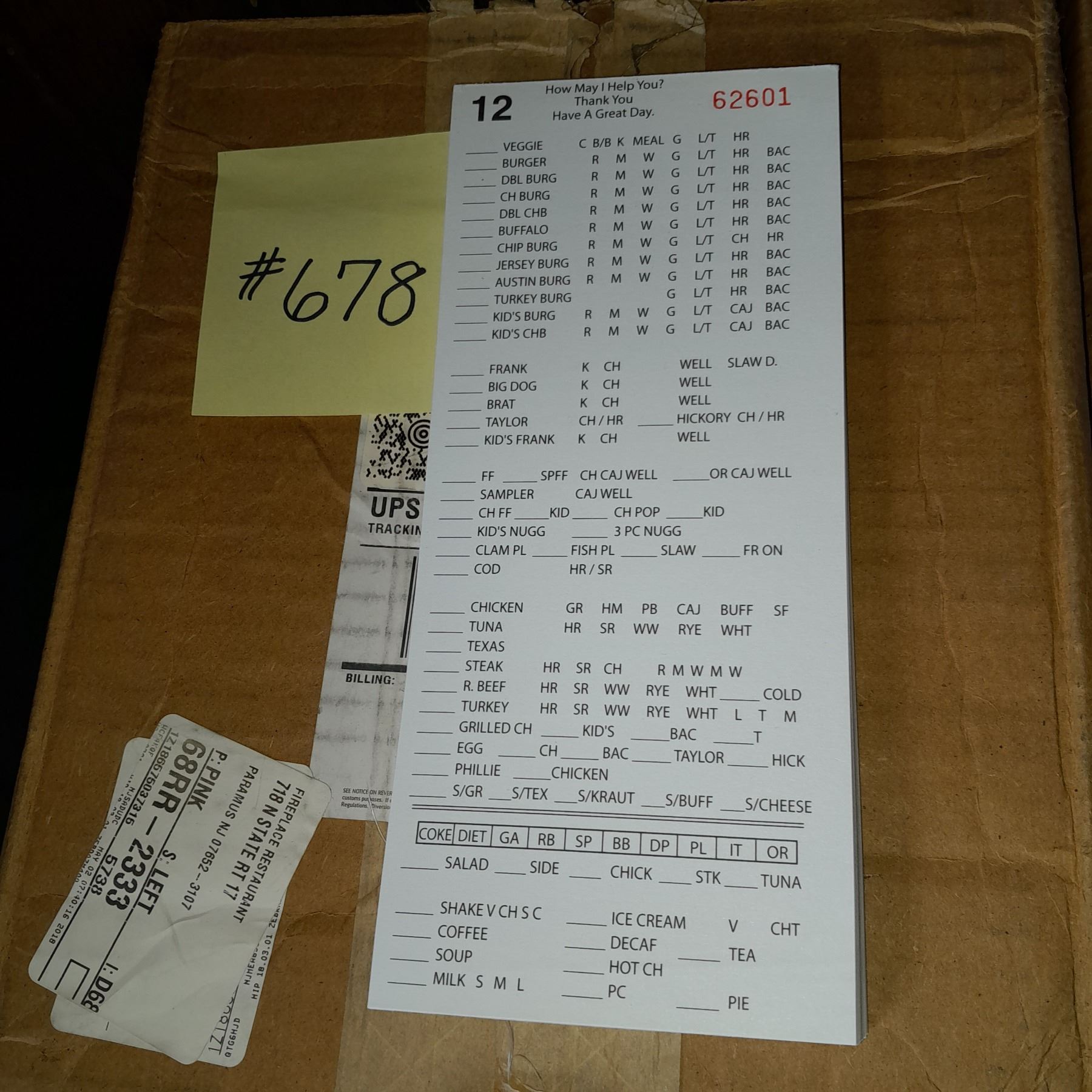 The Fireplace Restaurant - Large Box Of Customer Order Memo Pads
