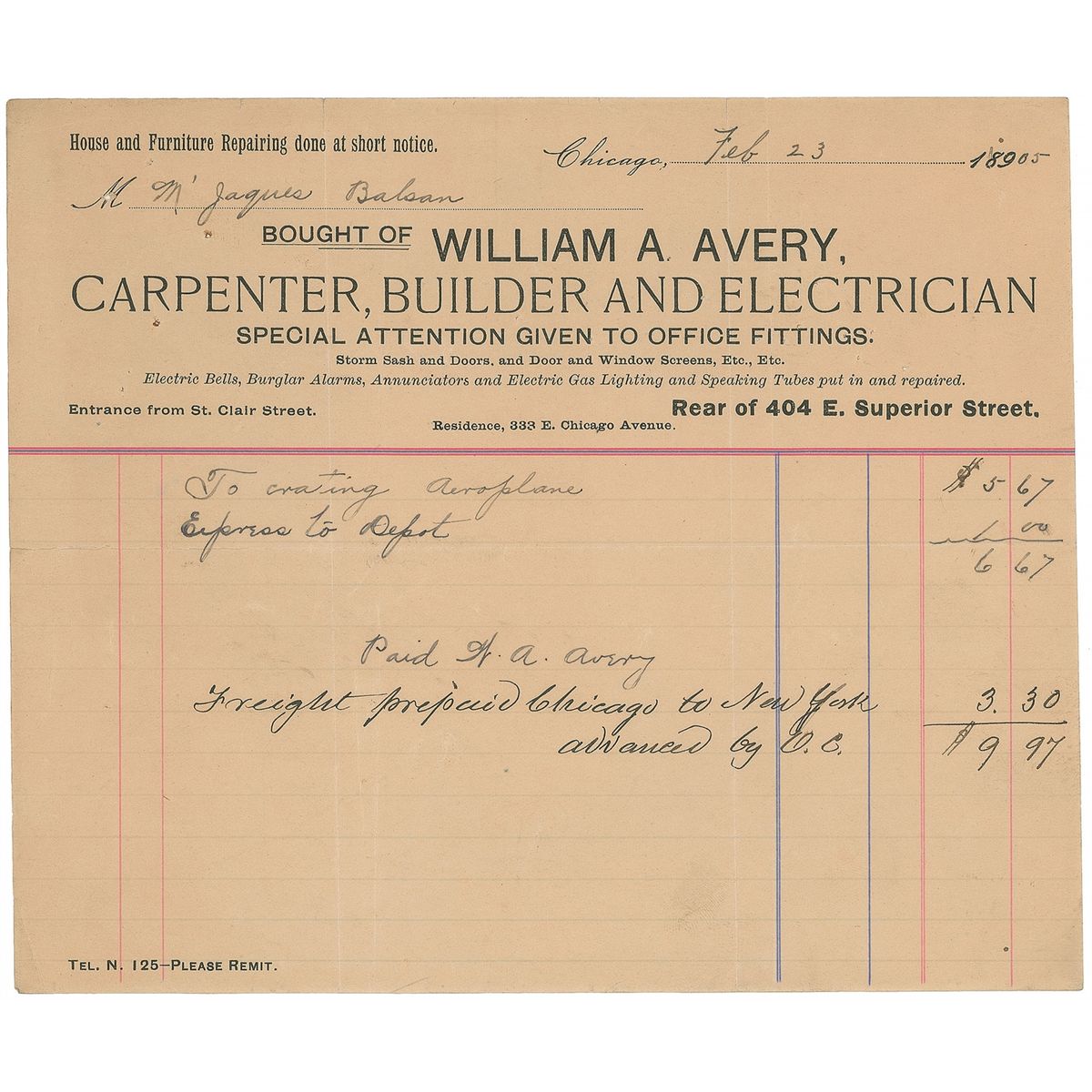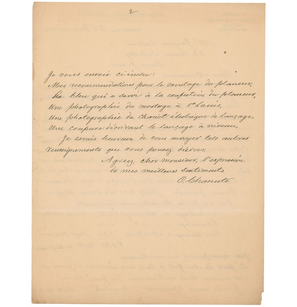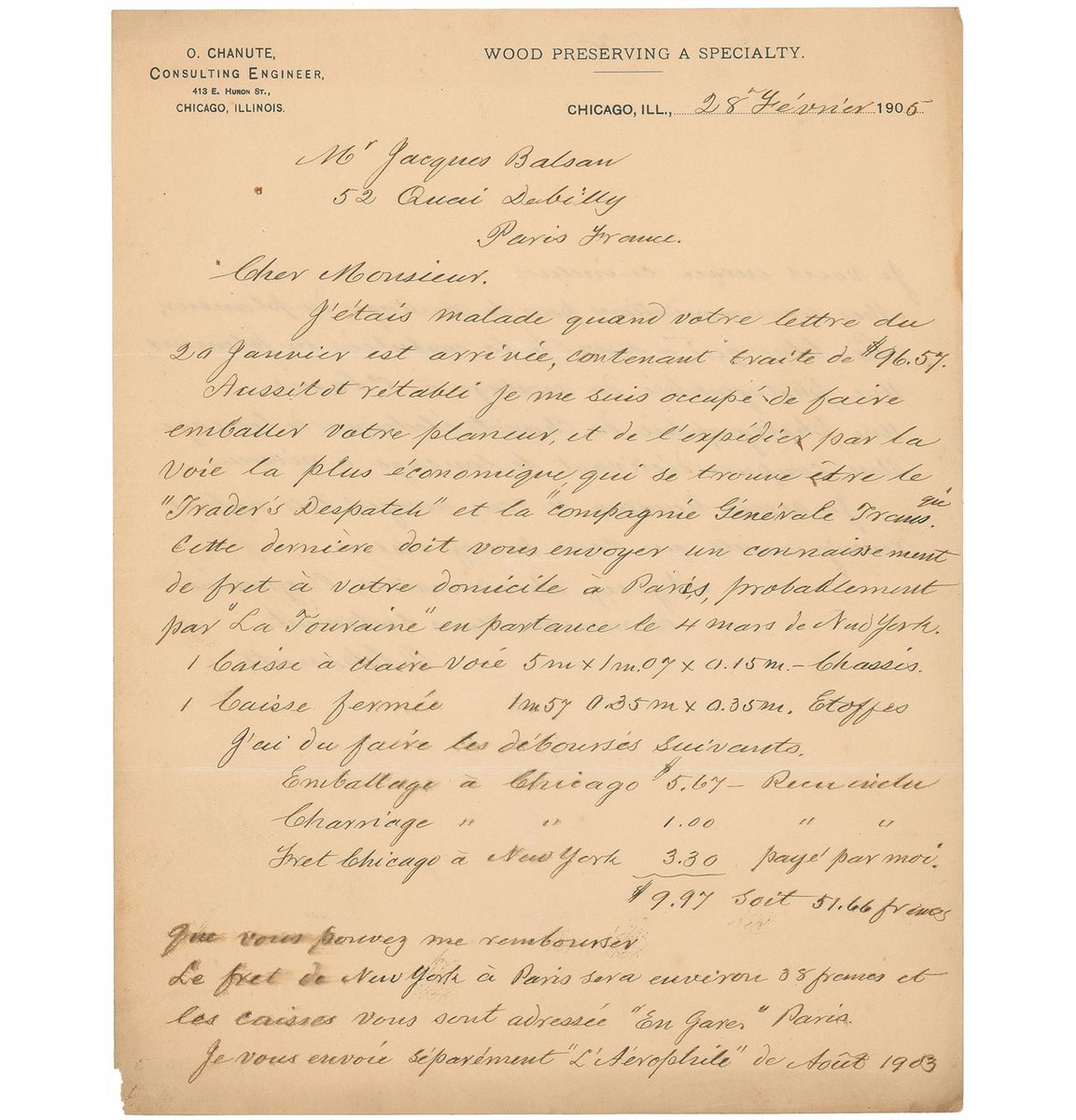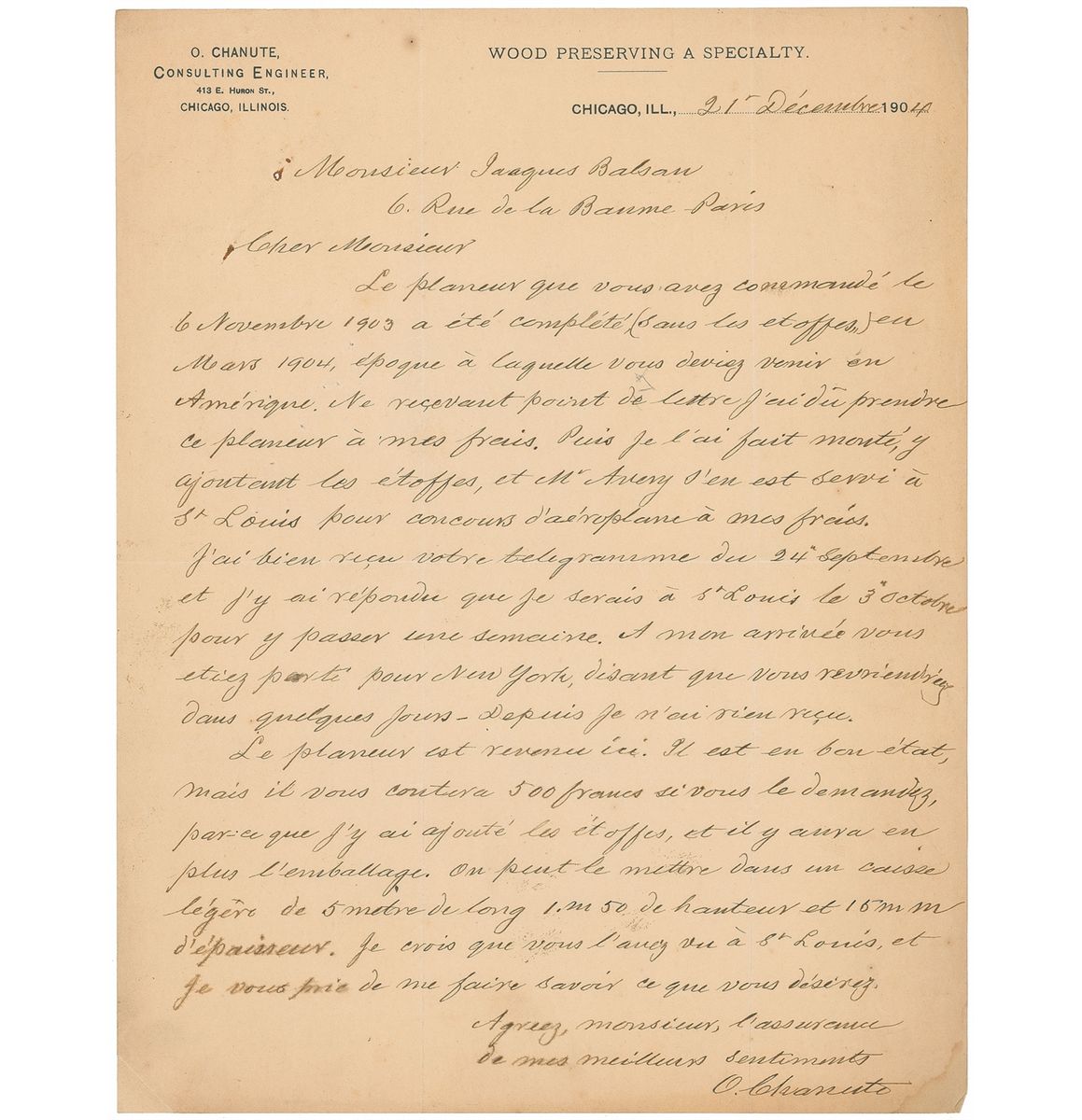 Small archive of material related to Octave Chanute and the first-ever sale of an aircraft in France, comprised of two ALSs in French by Chanute, a shipping invoice, and three photographs. Both letters are to aviator Jacques Balsan, who had ordered an aircraft in 1903. The first is signed “O. Chanute,” one page, 8.5 x 11, personal letterhead, December 21, 1904. In part (translated): “The glider you ordered on November 6, 1903, was finished (except for the fabric) in March 1904, the time at which you were coming to America. Receiving no letter from you, I had to take the glider at my own expense.” He then says he covered the glider, and that it was flown by William Avery at the St. Louis World's Fair in September of that year, continuing, “I received your telegram of September 24, 1904, and I replied that I would be in St. Louis from October 3 for a week. When I arrived, you already left for New York. The glider is back here (in Chicago), it is in good shape, but it will cost you 500 francs if you want it.” This letter was clearly successful, as the second ALS, also signed “O. Chanute,” one page both sides, 8.5 x 11, personal letterhead, February 28, 1905, offers detailed information about the shipping of the glider to Paris. The invoice is for crating an airplane and initialed by Chanute, “O. C.,” adding a note reading, “Freight prepaid Chicago to New York.” The three photos, all measuring 2.5 x 2, depict the Chanute-Herring glider. In overall very good to fine condition.