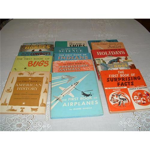 15 First Books with dust covers in good condition published 1949 and 1950's. All cloth bound, fully illustrated, all 7-3/8 x 8-3/4. Different authors and illustrators. Titles: American History, Antarctic, Horses, Cowboys, Bugs, Ships, Science, Indians, Prehistoric Animals, Weather, Ballet, Holidays, Airplanes, Surprising Facts, and Dogs. A great Christmas gift, and a great start for youngsters with exploring minds! What a Buy!