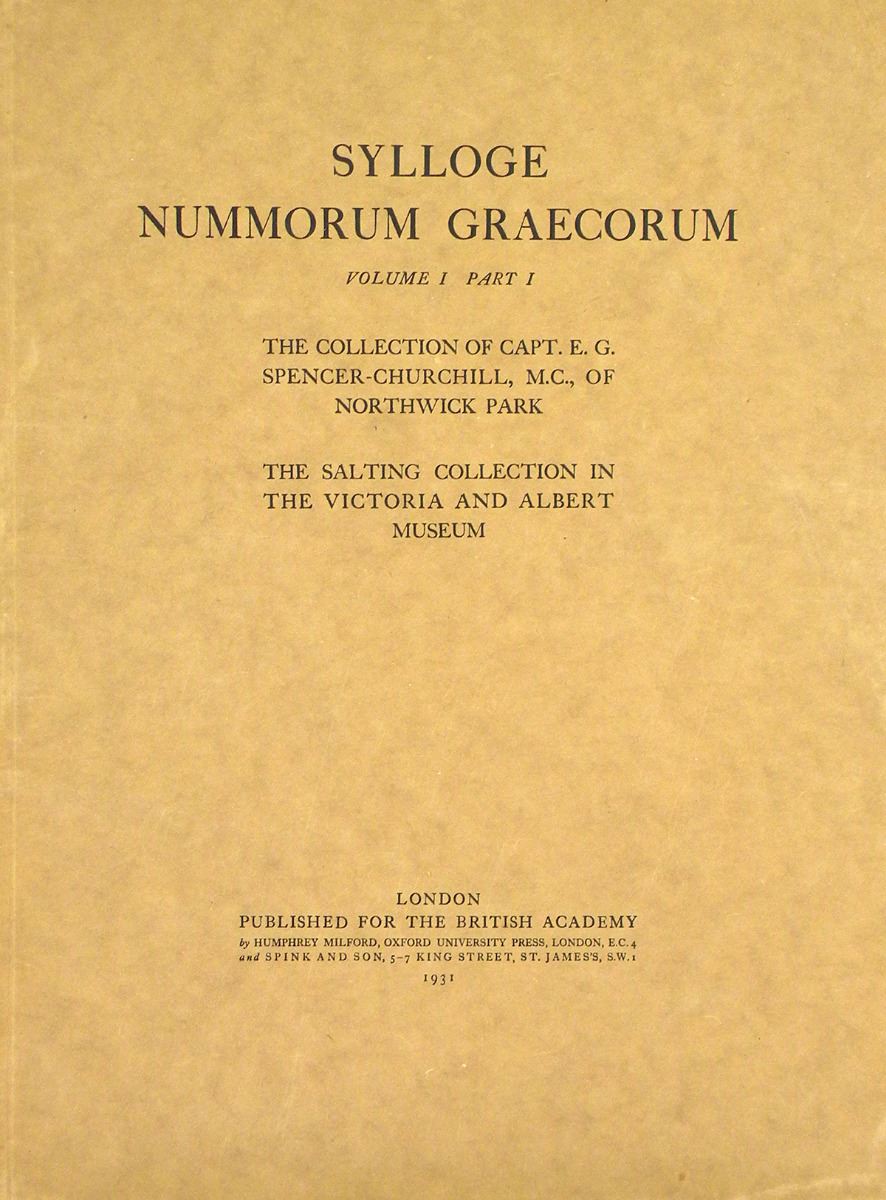 Sylloge Nummorum Graecorum. SYLLOGE NUMMORUM GRAECORUM. VOLUME I, PART I: THE COLLECTION OF CAPT. E.G. SPENCER-CHURCHILL, M.C., OF NORTHWICK PARK. THE SALTING COLLECTION IN THE VICTORIA AND ALBERT MUSEUM. London: Published for the British Academy, 1931. First edition. Folio, original brown printed card covers. (4), (1) pages; 8 fine plates of coins, each with a leaf of facing descriptive text. Light wear to covers; near fine. The first SNG volume published. Infrequently offered. Clain-Stefanelli 1913*. Daehn 1304.