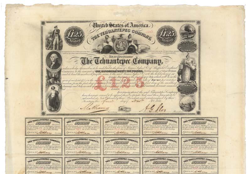 1853, Louisiana. 125 pounds sterling bond bearing 7% interest. Black. Red overprint. Extremely attractive engraved multi-vignetted bond. Integral coupons at bottom. The Tehuantepec Company was formed as a result of a grant given to Don Jose de Goray by in 1842 by Antonio Lopez de Santa Anna, President of the Republic of Mexico. The grant stated the purpose of the company was to open "a line of communication...between the Pacific and Atlantic Oceans, through the Isthmus of Tehuantepec" in Mexico. Through a combination of canals (whenever practicable), railroads and steam-carriages, the Tehuantepec Company would provide a fast, commercially feasible link between the two oceans opening a profitable Asiatic trade via San Francisco and Tehuantepec. Support of the concept was widespread and included Judah Benjamin, President Fillmore, Daniel Webster and numerous other notables. Unfortunately, the company dissolved amid a rivalry between the promoters and ultimately, financial failure. An attempt at resurrecting the company was begun with four rival groups claiming ownership to de Goray's original grant in 1842. An extremely historic forerunner to the Panama Canal. Uncancelled and extremely fine.