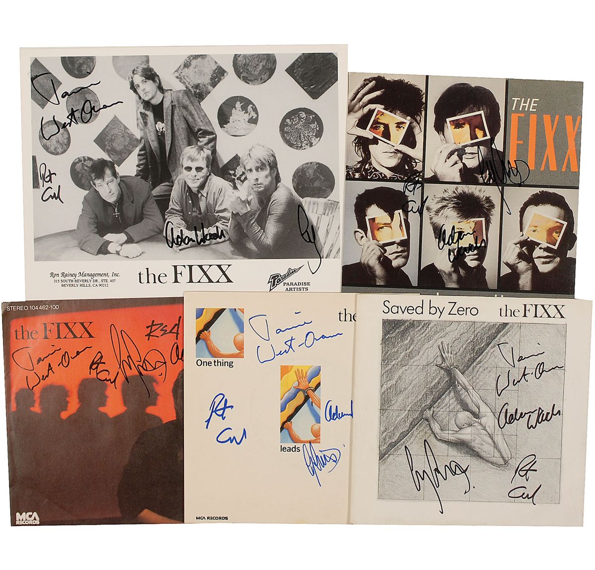Cardstock 10 x 8 Paradise Artists publicity group photo, signed in black felt tip by four original members: Cy Curnin, Adam Woods, Rupert Greenall, and Jamie West-Oram; and four 45 rpm singles (One Thing Leads to Another, Red Skies, Saved by Zero, and Secret Separation), each signed on the sleeve in black felt tip by the four members. In fine condition, with some creases to photo.