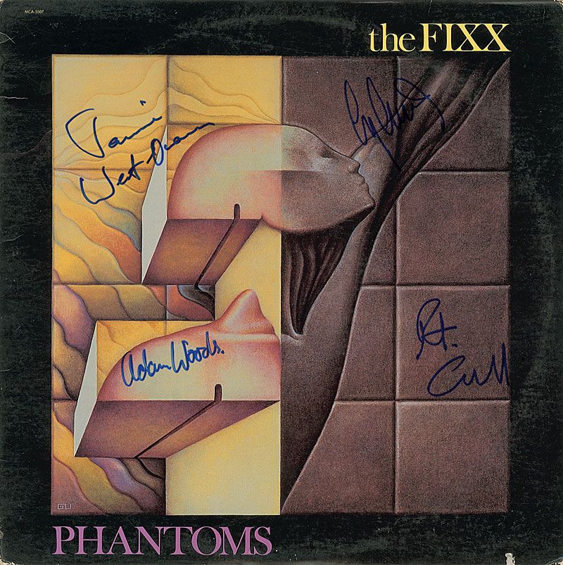 Phantoms album signed on the front cover in blue felt tip by Rupert Greenall, Jamie West-Oram, Cy Curnin, and Adam Woods. In fine condition, with a discount cut to the lower right. The record is included. Accompanied by a certificate of authenticity from Roger Epperson/REAL.