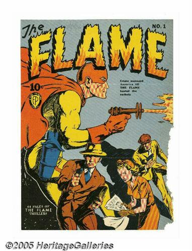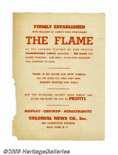 <B>The Flame #1 Promotional Cover Announcement (Fox Features Syndicate, 1940).</B></I> The Flame graduates from a feature in <B>Wonderworld Comics</B></I> to his own title with this rare promotional comic cover announcement. On the reverse is a message from Colonial News Co., Inc. that advises "there is no room for new comics but the good old ones can't miss making profits for you!!" They add, "Give this established favorite good display and watch him blaze the way to profits." The distributor who originally received this announcement recorded the date "6/13/40" on the front in pencil. The condition would be quite nice except for the obvious rodent chew at the right edge; like the other announcements offered here, this one has two horizontal folds to facilitate mailing in a standard business envelope.