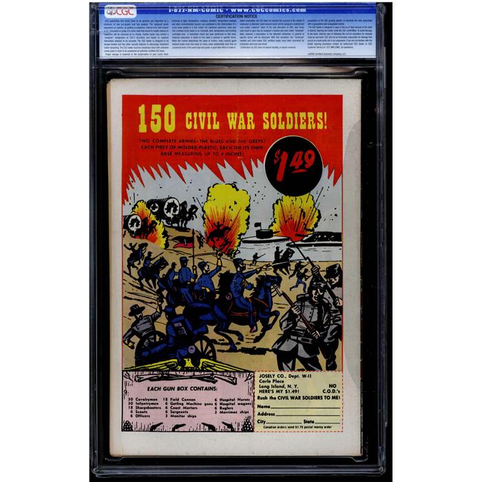 The Auctioneer has reserved the right to reject any and all bids, and to bid at the auction. Auctioneers Auctions are not on approval. Auctioneer does not allow certified material to be returned because of possible differences of opinion with respect to the grade offered by any third party organization, dealer, or service. Absolutely no guarantee of grade is offered for un-certified property sold and subsequently submitted to a third-party grading service. There will be no exceptions to this policy. Under extremely limited circumstances, (e.g. gross cataloging error) a purchaser, who did not bid from the floor, may request Auctioneer to evaluate voiding a sale; such request must be made in writing detailing the alleged gross error, and submission of the lot to the Auctioneer must be pre-approved by the Auctioneer. Bidder must notify Auctioneer in writing of such request within three (3) days of the non-floor bidder receipt of the lot. Any lot that is to be evaluated must be in our offices within 30 days after Auction. Grading does not qualify for this evaluation process nor do such complaints constitute a basis to challenge the authenticity of a lot. AFTER THAT 30-DAY PERIOD, NO LOTS MAY BE RETURNED FOR REASONS OTHER THAN AUTHENTICITY. Lots returned must be housed intact in the original holder. No lots purchased by floor Bidders may be returned (including those Bidders acting as agents for others). Late remittance for purchases may be considered just cause to revoke all return privileges. B: Auctions conducted solely on the Internet have a THREE (3) DAY RETURN POLICY: Lots paid for within seven days of the Auction closing are sold with a three (3) day return privilege. You may return lots under the following conditions: Within three days of receipt of the lot, you must first notify Auctioneer by contacting Client Service by phone (314-680-8599) or e-mail (moundcityauctions@gmail.com), and immediately mail the lot(s) fully insured to the attention of Returns, Mound City Auctions 1081 Teson Rd. Hazelwood, MO. 63042. Lots must be housed intact in their original holder and in their original condition. You are responsible for the insured, safe delivery of any lots. Auctioneer will not be responsible for lots returned in non-registered mail or lots returned without prior authorization per section B. A non-negotiable return fee of 5% of the purchase price ($10 per lot minimum) will be deducted from the refund for each returned lot or billed directly. Postage and handling fees are not refunded. After the three-day period (from receipt), no items may be returned for any reason. Late remittance for purchases revokes all Return-Restock privileges. C: Bidders who have inspected the lots prior to the auction will not be granted any return privileges. D: Comic books sold referencing a third-party grading service are sold “as is” without any express or implied warranty. Certain warranties may be available from the grading services and the Bidder is referred to them for further details: Certified Guaranty Company, LLC. (CGC), P.O. Box 4738, Sarasota, FL 34230. E: Bidders who intend to challenge authenticity or provenance of a lot must notify Auctioneer in writing within thirty (30) days of the Auctions conclusion. In the event Auctioneer cannot deliver the lot or subsequently it is established that the lot lacks title, provenance, authenticity, or other transfer or condition issue is claimed, Auctioneer's liability shall be limited to rescission of sale and refund of purchase price; in no case shall Auctioneer's maximum liability exceed the high bid on that lot, which bid shall be deemed for all purposes the value of the lot. After one year has elapsed, Auctioneer's maximum liability shall be limited to any commissions and fees Auctioneer earned on that lot. F: All comics are guaranteed genuine, but are not guaranteed as to grade, since grading is a matter of opinion, an art and not a science, and therefore the opinion rendered by the Auctioneer or any third party grading service may not agree with the opinion of others (including trained experts), and the same expert may not grade the same item with the same grade at two different times. G: Since we cannot examine encapsulated comics, they are sold “as is”without our grading opinion, and may not be returned for any reason. Auctioneer shall not be liable for any patent or latent defect or controversy pertaining to or arising from any encapsulated collectible. In any such instance, purchaser's remedy, if any, shall be solely against the service certifying the collectible. H: Due to changing grading standards over time, differing interpretations, and to possible mishandling of items by subsequent owners, Auctioneer reserves the right to grade items differently than shown on certificates from any grading service that accompany the items. Auctioneer also reserves the right to grade items differently than the grades shown in the prior catalog should such items be reconsigned to any future auction. I: Although consensus grading is employed by most grading services, it should be noted as aforesaid that grading is not an exact science. In fact, it is entirely possible that if a lot is broken out of a plastic holder and resubmitted to another grading service or even to the same service, the lot could come back with a different grade assigned. J: Certification does not guarantee protection against the normal risks associated with potentially volatile markets. The degree of liquidity for certified collectibles will vary according to general market conditions and the particular lot involved. For some lots there may be no active market at all at certain points in time."