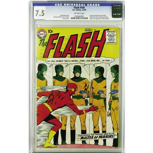 <B>The Flash #105 (DC, 1959) CGC VF- 7.5 Off-white pages.</B></I> This is one of the ten most valuable Silver Age comics according to Overstreet -- it's the first issue of the series, continuing the numbering from the Golden Age <B>Flash Comics</B></I>. The new Flash character had earned his own title after being a smash success in his first few appearances in the pages of <B>Showcase</B></I>. The origin of the new character is retold here, and in the villain department there's the origin and first appearance of the Mirror Master. The cover and interior art are by Carmine Infantino. Overstreet 2006 VF 8.0 value = $3,898. CGC census 3/06: 6 in 7.5, 7 higher.