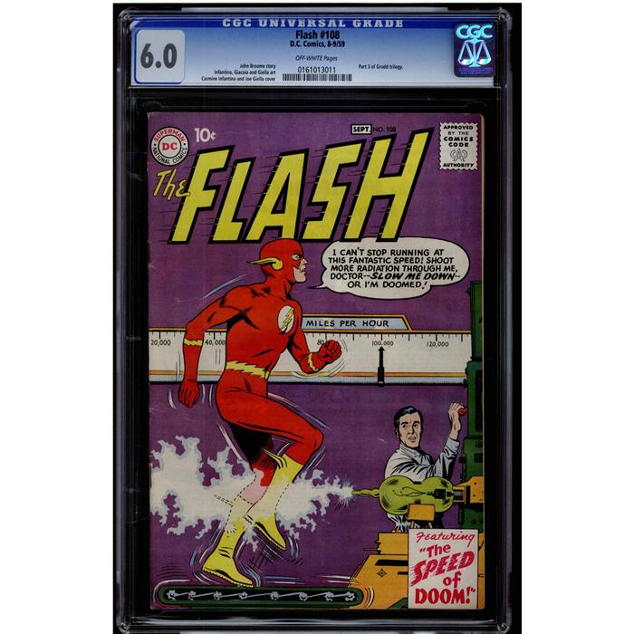 The Flash #108 CGC 6.0 off white pages. Overstreet 2009 FN 6.0 value = $249. The CGC universal census reports 4 at 6.0 with 16 higher