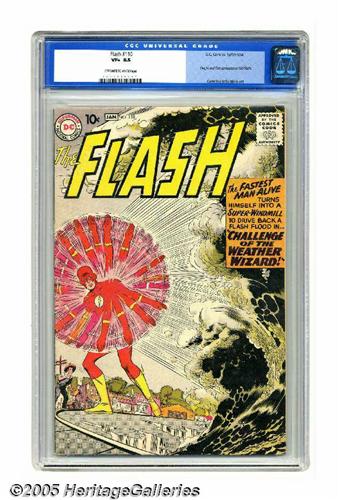 <B>The Flash #110 (DC, 1959) CGC VF+ 8.5 Off-white to white pages.</B></I> Kid Flash raced into his first appearance here, in an issue that also tells his origin. Note that the character, Wally West, went on to become the Flash a couple of decades later and is still the Flash today, meaning the significance, and therefore the value, of this first appearance can only grow. There's also a first appearance in the villain department, as the Weather Wizard darkens the skies for the first time here. The issue's cover and art are by Carmine Infantino. Overstreet 2005 VF 8.0 value = $1,029; VF/NM 9.0 value = $1,665. CGC census 6/05: 2 in 8.5, 3 higher.