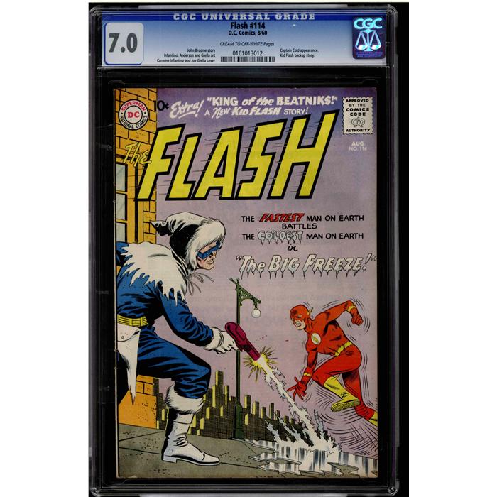 The Flash #114 CGC 7.0 cream to off white pages. John Broome story, Infantino, Anderson, and Giella art. Carmine Infantino and Joe Giella cover. Captain Cold appearance. Kid Flash backup story. Overstreet 2009 FN 6.0 value = $120; VF 8.0 value = $312. CGC census: 6 at 7.0, 17 higher.