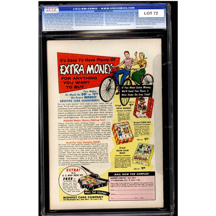 The Auctioneer has reserved the right to reject any and all bids, and to bid at the auction. Auctioneers Auctions are not on approval. Auctioneer does not allow certified material to be returned because of possible differences of opinion with respect to the grade offered by any third party organization, dealer, or service. Absolutely no guarantee of grade is offered for un-certified property sold and subsequently submitted to a third-party grading service. There will be no exceptions to this policy. Under extremely limited circumstances, (e.g. gross cataloging error) a purchaser, who did not bid from the floor, may request Auctioneer to evaluate voiding a sale; such request must be made in writing detailing the alleged gross error, and submission of the lot to the Auctioneer must be pre-approved by the Auctioneer. Bidder must notify Auctioneer in writing of such request within three (3) days of the non-floor bidder receipt of the lot. Any lot that is to be evaluated must be in our offices within 30 days after Auction. Grading does not qualify for this evaluation process nor do such complaints constitute a basis to challenge the authenticity of a lot. AFTER THAT 30-DAY PERIOD, NO LOTS MAY BE RETURNED FOR REASONS OTHER THAN AUTHENTICITY. Lots returned must be housed intact in the original holder. No lots purchased by floor Bidders may be returned (including those Bidders acting as agents for others). Late remittance for purchases may be considered just cause to revoke all return privileges. B: Auctions conducted solely on the Internet have a THREE (3) DAY RETURN POLICY: Lots paid for within seven days of the Auction closing are sold with a three (3) day return privilege. You may return lots under the following conditions: Within three days of receipt of the lot, you must first notify Auctioneer by contacting Client Service by phone (314-680-8599) or e-mail (moundcityauctions@gmail.com), and immediately mail the lot(s) fully insured to the attention of Returns, Mound City Auctions 1081 Teson Rd. Hazelwood, MO. 63042. Lots must be housed intact in their original holder and in their original condition. You are responsible for the insured, safe delivery of any lots. Auctioneer will not be responsible for lots returned in non-registered mail or lots returned without prior authorization per section B. A non-negotiable return fee of 5% of the purchase price ($10 per lot minimum) will be deducted from the refund for each returned lot or billed directly. Postage and handling fees are not refunded. After the three-day period (from receipt), no items may be returned for any reason. Late remittance for purchases revokes all Return-Restock privileges. C: Bidders who have inspected the lots prior to the auction will not be granted any return privileges. D: Comic books sold referencing a third-party grading service are sold “as is” without any express or implied warranty. Certain warranties may be available from the grading services and the Bidder is referred to them for further details: Certified Guaranty Company, LLC. (CGC), P.O. Box 4738, Sarasota, FL 34230. E: Bidders who intend to challenge authenticity or provenance of a lot must notify Auctioneer in writing within thirty (30) days of the Auctions conclusion. In the event Auctioneer cannot deliver the lot or subsequently it is established that the lot lacks title, provenance, authenticity, or other transfer or condition issue is claimed, Auctioneer's liability shall be limited to rescission of sale and refund of purchase price; in no case shall Auctioneer's maximum liability exceed the high bid on that lot, which bid shall be deemed for all purposes the value of the lot. After one year has elapsed, Auctioneer's maximum liability shall be limited to any commissions and fees Auctioneer earned on that lot. F: All comics are guaranteed genuine, but are not guaranteed as to grade, since grading is a matter of opinion, an art and not a science, and therefore the opinion rendered by the Auctioneer or any third party grading service may not agree with the opinion of others (including trained experts), and the same expert may not grade the same item with the same grade at two different times. G: Since we cannot examine encapsulated comics, they are sold “as is”without our grading opinion, and may not be returned for any reason. Auctioneer shall not be liable for any patent or latent defect or controversy pertaining to or arising from any encapsulated collectible. In any such instance, purchaser's remedy, if any, shall be solely against the service certifying the collectible. H: Due to changing grading standards over time, differing interpretations, and to possible mishandling of items by subsequent owners, Auctioneer reserves the right to grade items differently than shown on certificates from any grading service that accompany the items. Auctioneer also reserves the right to grade items differently than the grades shown in the prior catalog should such items be reconsigned to any future auction. I: Although consensus grading is employed by most grading services, it should be noted as aforesaid that grading is not an exact science. In fact, it is entirely possible that if a lot is broken out of a plastic holder and resubmitted to another grading service or even to the same service, the lot could come back with a different grade assigned. J: Certification does not guarantee protection against the normal risks associated with potentially volatile markets. The degree of liquidity for certified collectibles will vary according to general market conditions and the particular lot involved. For some lots there may be no active market at all at certain points in time."