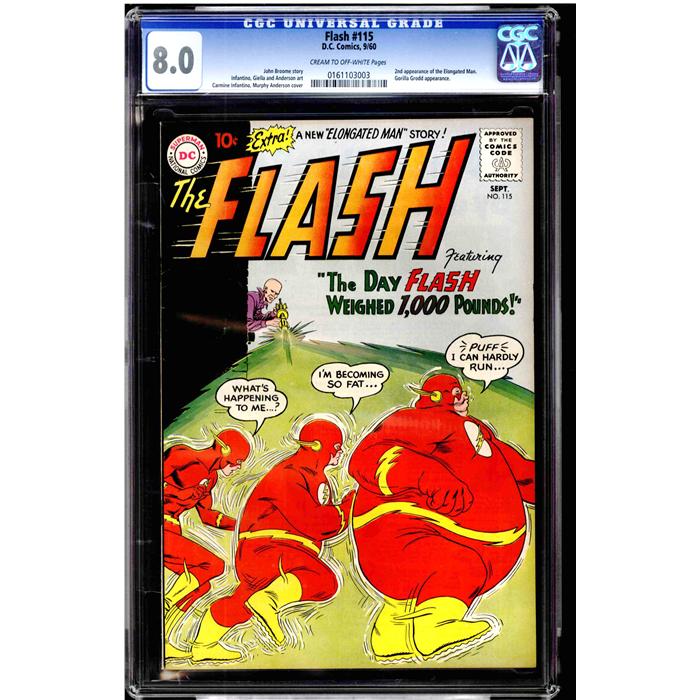 The Flash #115 CGC 8.0 cream to off-white pages. John Broome story, Infantino, Giella and Anderson art, Carmine Infantino, Murphy Anderson cover. 2nd appearance of the Elongated Man. Gorilla Grodd appearance. Overstreet 2009 VF 8.0 value = $246. CGC census: 5 at 8.0, only 3 higher.