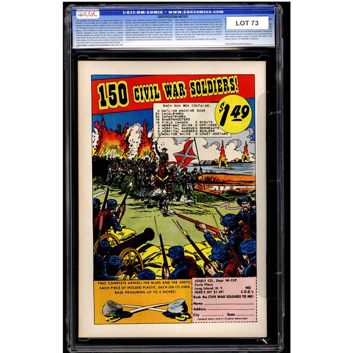 The Auctioneer has reserved the right to reject any and all bids, and to bid at the auction. Auctioneers Auctions are not on approval. Auctioneer does not allow certified material to be returned because of possible differences of opinion with respect to the grade offered by any third party organization, dealer, or service. Absolutely no guarantee of grade is offered for un-certified property sold and subsequently submitted to a third-party grading service. There will be no exceptions to this policy. Under extremely limited circumstances, (e.g. gross cataloging error) a purchaser, who did not bid from the floor, may request Auctioneer to evaluate voiding a sale; such request must be made in writing detailing the alleged gross error, and submission of the lot to the Auctioneer must be pre-approved by the Auctioneer. Bidder must notify Auctioneer in writing of such request within three (3) days of the non-floor bidder receipt of the lot. Any lot that is to be evaluated must be in our offices within 30 days after Auction. Grading does not qualify for this evaluation process nor do such complaints constitute a basis to challenge the authenticity of a lot. AFTER THAT 30-DAY PERIOD, NO LOTS MAY BE RETURNED FOR REASONS OTHER THAN AUTHENTICITY. Lots returned must be housed intact in the original holder. No lots purchased by floor Bidders may be returned (including those Bidders acting as agents for others). Late remittance for purchases may be considered just cause to revoke all return privileges. B: Auctions conducted solely on the Internet have a THREE (3) DAY RETURN POLICY: Lots paid for within seven days of the Auction closing are sold with a three (3) day return privilege. You may return lots under the following conditions: Within three days of receipt of the lot, you must first notify Auctioneer by contacting Client Service by phone (314-680-8599) or e-mail (moundcityauctions@gmail.com), and immediately mail the lot(s) fully insured to the attention of Returns, Mound City Auctions 1081 Teson Rd. Hazelwood, MO. 63042. Lots must be housed intact in their original holder and in their original condition. You are responsible for the insured, safe delivery of any lots. Auctioneer will not be responsible for lots returned in non-registered mail or lots returned without prior authorization per section B. A non-negotiable return fee of 5% of the purchase price ($10 per lot minimum) will be deducted from the refund for each returned lot or billed directly. Postage and handling fees are not refunded. After the three-day period (from receipt), no items may be returned for any reason. Late remittance for purchases revokes all Return-Restock privileges. C: Bidders who have inspected the lots prior to the auction will not be granted any return privileges. D: Comic books sold referencing a third-party grading service are sold “as is” without any express or implied warranty. Certain warranties may be available from the grading services and the Bidder is referred to them for further details: Certified Guaranty Company, LLC. (CGC), P.O. Box 4738, Sarasota, FL 34230. E: Bidders who intend to challenge authenticity or provenance of a lot must notify Auctioneer in writing within thirty (30) days of the Auctions conclusion. In the event Auctioneer cannot deliver the lot or subsequently it is established that the lot lacks title, provenance, authenticity, or other transfer or condition issue is claimed, Auctioneer's liability shall be limited to rescission of sale and refund of purchase price; in no case shall Auctioneer's maximum liability exceed the high bid on that lot, which bid shall be deemed for all purposes the value of the lot. After one year has elapsed, Auctioneer's maximum liability shall be limited to any commissions and fees Auctioneer earned on that lot. F: All comics are guaranteed genuine, but are not guaranteed as to grade, since grading is a matter of opinion, an art and not a science, and therefore the opinion rendered by the Auctioneer or any third party grading service may not agree with the opinion of others (including trained experts), and the same expert may not grade the same item with the same grade at two different times. G: Since we cannot examine encapsulated comics, they are sold “as is”without our grading opinion, and may not be returned for any reason. Auctioneer shall not be liable for any patent or latent defect or controversy pertaining to or arising from any encapsulated collectible. In any such instance, purchaser's remedy, if any, shall be solely against the service certifying the collectible. H: Due to changing grading standards over time, differing interpretations, and to possible mishandling of items by subsequent owners, Auctioneer reserves the right to grade items differently than shown on certificates from any grading service that accompany the items. Auctioneer also reserves the right to grade items differently than the grades shown in the prior catalog should such items be reconsigned to any future auction. I: Although consensus grading is employed by most grading services, it should be noted as aforesaid that grading is not an exact science. In fact, it is entirely possible that if a lot is broken out of a plastic holder and resubmitted to another grading service or even to the same service, the lot could come back with a different grade assigned. J: Certification does not guarantee protection against the normal risks associated with potentially volatile markets. The degree of liquidity for certified collectibles will vary according to general market conditions and the particular lot involved. For some lots there may be no active market at all at certain points in time."
