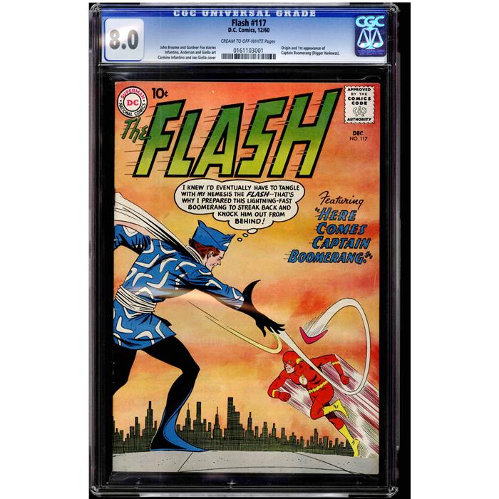 The Flash #117 CGC 8.0 cream to off-white pages. John Brrome and Gardner Fox stories, Infantino, Anderson, and Giella art, Carmine Infantino and Joe Giella cover. Origin and 1st appearance of Captain Boomerang (Digger Harkness). Overstreet 2009 VF 8.0 value = $277. CGC census: 7 at 8.0, 11 higher.