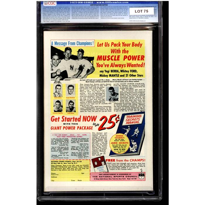 The Auctioneer has reserved the right to reject any and all bids, and to bid at the auction. Auctioneers Auctions are not on approval. Auctioneer does not allow certified material to be returned because of possible differences of opinion with respect to the grade offered by any third party organization, dealer, or service. Absolutely no guarantee of grade is offered for un-certified property sold and subsequently submitted to a third-party grading service. There will be no exceptions to this policy. Under extremely limited circumstances, (e.g. gross cataloging error) a purchaser, who did not bid from the floor, may request Auctioneer to evaluate voiding a sale; such request must be made in writing detailing the alleged gross error, and submission of the lot to the Auctioneer must be pre-approved by the Auctioneer. Bidder must notify Auctioneer in writing of such request within three (3) days of the non-floor bidder receipt of the lot. Any lot that is to be evaluated must be in our offices within 30 days after Auction. Grading does not qualify for this evaluation process nor do such complaints constitute a basis to challenge the authenticity of a lot. AFTER THAT 30-DAY PERIOD, NO LOTS MAY BE RETURNED FOR REASONS OTHER THAN AUTHENTICITY. Lots returned must be housed intact in the original holder. No lots purchased by floor Bidders may be returned (including those Bidders acting as agents for others). Late remittance for purchases may be considered just cause to revoke all return privileges. B: Auctions conducted solely on the Internet have a THREE (3) DAY RETURN POLICY: Lots paid for within seven days of the Auction closing are sold with a three (3) day return privilege. You may return lots under the following conditions: Within three days of receipt of the lot, you must first notify Auctioneer by contacting Client Service by phone (314-680-8599) or e-mail (moundcityauctions@gmail.com), and immediately mail the lot(s) fully insured to the attention of Returns, Mound City Auctions 1081 Teson Rd. Hazelwood, MO. 63042. Lots must be housed intact in their original holder and in their original condition. You are responsible for the insured, safe delivery of any lots. Auctioneer will not be responsible for lots returned in non-registered mail or lots returned without prior authorization per section B. A non-negotiable return fee of 5% of the purchase price ($10 per lot minimum) will be deducted from the refund for each returned lot or billed directly. Postage and handling fees are not refunded. After the three-day period (from receipt), no items may be returned for any reason. Late remittance for purchases revokes all Return-Restock privileges. C: Bidders who have inspected the lots prior to the auction will not be granted any return privileges. D: Comic books sold referencing a third-party grading service are sold “as is” without any express or implied warranty. Certain warranties may be available from the grading services and the Bidder is referred to them for further details: Certified Guaranty Company, LLC. (CGC), P.O. Box 4738, Sarasota, FL 34230. E: Bidders who intend to challenge authenticity or provenance of a lot must notify Auctioneer in writing within thirty (30) days of the Auctions conclusion. In the event Auctioneer cannot deliver the lot or subsequently it is established that the lot lacks title, provenance, authenticity, or other transfer or condition issue is claimed, Auctioneer's liability shall be limited to rescission of sale and refund of purchase price; in no case shall Auctioneer's maximum liability exceed the high bid on that lot, which bid shall be deemed for all purposes the value of the lot. After one year has elapsed, Auctioneer's maximum liability shall be limited to any commissions and fees Auctioneer earned on that lot. F: All comics are guaranteed genuine, but are not guaranteed as to grade, since grading is a matter of opinion, an art and not a science, and therefore the opinion rendered by the Auctioneer or any third party grading service may not agree with the opinion of others (including trained experts), and the same expert may not grade the same item with the same grade at two different times. G: Since we cannot examine encapsulated comics, they are sold “as is”without our grading opinion, and may not be returned for any reason. Auctioneer shall not be liable for any patent or latent defect or controversy pertaining to or arising from any encapsulated collectible. In any such instance, purchaser's remedy, if any, shall be solely against the service certifying the collectible. H: Due to changing grading standards over time, differing interpretations, and to possible mishandling of items by subsequent owners, Auctioneer reserves the right to grade items differently than shown on certificates from any grading service that accompany the items. Auctioneer also reserves the right to grade items differently than the grades shown in the prior catalog should such items be reconsigned to any future auction. I: Although consensus grading is employed by most grading services, it should be noted as aforesaid that grading is not an exact science. In fact, it is entirely possible that if a lot is broken out of a plastic holder and resubmitted to another grading service or even to the same service, the lot could come back with a different grade assigned. J: Certification does not guarantee protection against the normal risks associated with potentially volatile markets. The degree of liquidity for certified collectibles will vary according to general market conditions and the particular lot involved. For some lots there may be no active market at all at certain points in time."