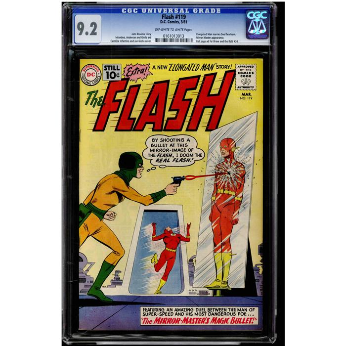 The Flash #119 CGC 9.2 off white to white pages. John Broome story, Infantino, Adnerson and Giella art. Carmine Infantino and Joe Giella cover. Elongated Man marries Sue Dearborn. Mirror Master appearance. Full page ad for Brave and the Bold #34. Overstreet 2009 NM 9.2 value = $675. CGC census: 2 at 9.2, none higher. One of the two best known copies!