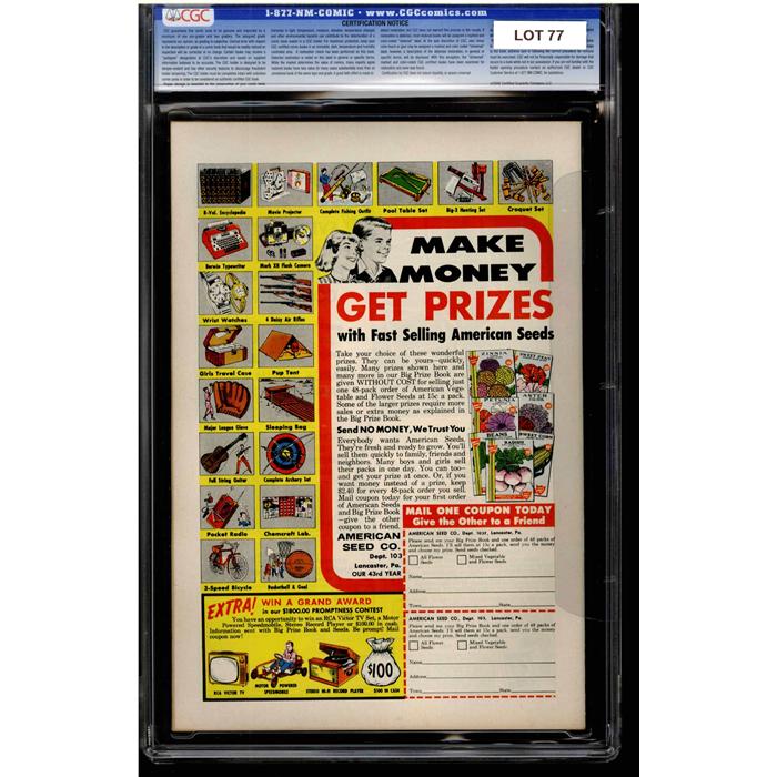 The Auctioneer has reserved the right to reject any and all bids, and to bid at the auction. Auctioneers Auctions are not on approval. Auctioneer does not allow certified material to be returned because of possible differences of opinion with respect to the grade offered by any third party organization, dealer, or service. Absolutely no guarantee of grade is offered for un-certified property sold and subsequently submitted to a third-party grading service. There will be no exceptions to this policy. Under extremely limited circumstances, (e.g. gross cataloging error) a purchaser, who did not bid from the floor, may request Auctioneer to evaluate voiding a sale; such request must be made in writing detailing the alleged gross error, and submission of the lot to the Auctioneer must be pre-approved by the Auctioneer. Bidder must notify Auctioneer in writing of such request within three (3) days of the non-floor bidder receipt of the lot. Any lot that is to be evaluated must be in our offices within 30 days after Auction. Grading does not qualify for this evaluation process nor do such complaints constitute a basis to challenge the authenticity of a lot. AFTER THAT 30-DAY PERIOD, NO LOTS MAY BE RETURNED FOR REASONS OTHER THAN AUTHENTICITY. Lots returned must be housed intact in the original holder. No lots purchased by floor Bidders may be returned (including those Bidders acting as agents for others). Late remittance for purchases may be considered just cause to revoke all return privileges. B: Auctions conducted solely on the Internet have a THREE (3) DAY RETURN POLICY: Lots paid for within seven days of the Auction closing are sold with a three (3) day return privilege. You may return lots under the following conditions: Within three days of receipt of the lot, you must first notify Auctioneer by contacting Client Service by phone (314-680-8599) or e-mail (moundcityauctions@gmail.com), and immediately mail the lot(s) fully insured to the attention of Returns, Mound City Auctions 1081 Teson Rd. Hazelwood, MO. 63042. Lots must be housed intact in their original holder and in their original condition. You are responsible for the insured, safe delivery of any lots. Auctioneer will not be responsible for lots returned in non-registered mail or lots returned without prior authorization per section B. A non-negotiable return fee of 5% of the purchase price ($10 per lot minimum) will be deducted from the refund for each returned lot or billed directly. Postage and handling fees are not refunded. After the three-day period (from receipt), no items may be returned for any reason. Late remittance for purchases revokes all Return-Restock privileges. C: Bidders who have inspected the lots prior to the auction will not be granted any return privileges. D: Comic books sold referencing a third-party grading service are sold “as is” without any express or implied warranty. Certain warranties may be available from the grading services and the Bidder is referred to them for further details: Certified Guaranty Company, LLC. (CGC), P.O. Box 4738, Sarasota, FL 34230. E: Bidders who intend to challenge authenticity or provenance of a lot must notify Auctioneer in writing within thirty (30) days of the Auctions conclusion. In the event Auctioneer cannot deliver the lot or subsequently it is established that the lot lacks title, provenance, authenticity, or other transfer or condition issue is claimed, Auctioneer's liability shall be limited to rescission of sale and refund of purchase price; in no case shall Auctioneer's maximum liability exceed the high bid on that lot, which bid shall be deemed for all purposes the value of the lot. After one year has elapsed, Auctioneer's maximum liability shall be limited to any commissions and fees Auctioneer earned on that lot. F: All comics are guaranteed genuine, but are not guaranteed as to grade, since grading is a matter of opinion, an art and not a science, and therefore the opinion rendered by the Auctioneer or any third party grading service may not agree with the opinion of others (including trained experts), and the same expert may not grade the same item with the same grade at two different times. G: Since we cannot examine encapsulated comics, they are sold “as is”without our grading opinion, and may not be returned for any reason. Auctioneer shall not be liable for any patent or latent defect or controversy pertaining to or arising from any encapsulated collectible. In any such instance, purchaser's remedy, if any, shall be solely against the service certifying the collectible. H: Due to changing grading standards over time, differing interpretations, and to possible mishandling of items by subsequent owners, Auctioneer reserves the right to grade items differently than shown on certificates from any grading service that accompany the items. Auctioneer also reserves the right to grade items differently than the grades shown in the prior catalog should such items be reconsigned to any future auction. I: Although consensus grading is employed by most grading services, it should be noted as aforesaid that grading is not an exact science. In fact, it is entirely possible that if a lot is broken out of a plastic holder and resubmitted to another grading service or even to the same service, the lot could come back with a different grade assigned. J: Certification does not guarantee protection against the normal risks associated with potentially volatile markets. The degree of liquidity for certified collectibles will vary according to general market conditions and the particular lot involved. For some lots there may be no active market at all at certain points in time."