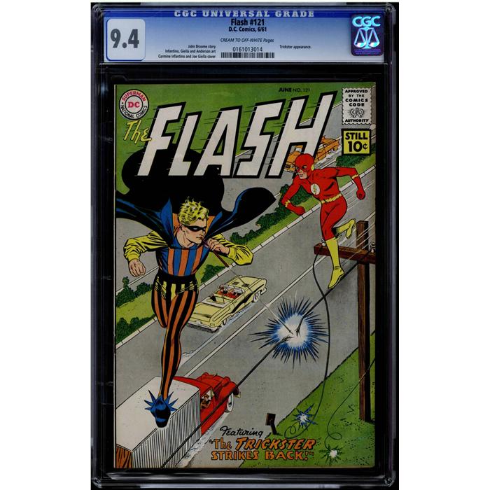 The Flash #121 CGC 9.4 cream to off white pages. John Broome story, Infantino, Giella and Anderson art. Carmine Infantino and Joe Giella cover. Trickster appearance. Overstreet 2009 NM 9.2 value = $525. CGC census: 2 at 9.4, none higher. One of the two best known copies!