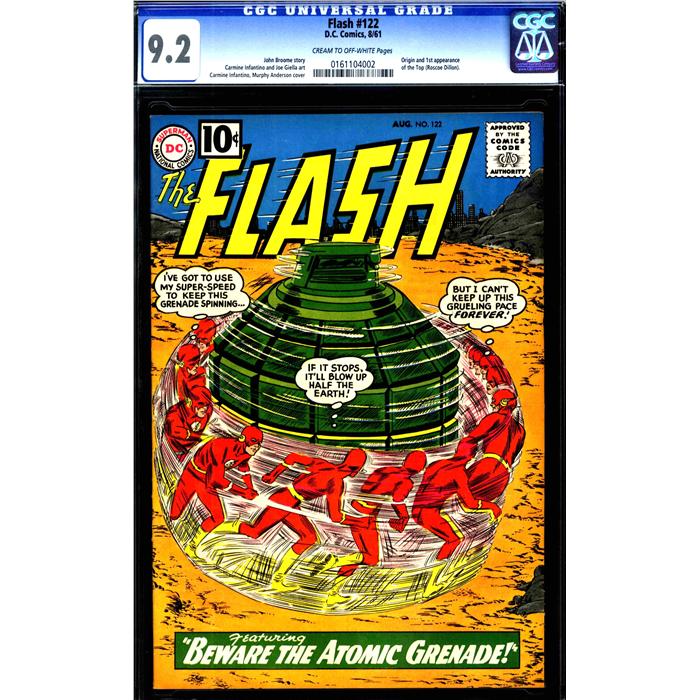 The Flash #122 CGC 9.2 cream to off-white pages. John Broome story. Carmine Infantino and Joe Giella art. Carmine Infantino Murphy Anderson cover. Origin and 1st appearance of the Top (Roscoe Dillon). Overstreet 2009 NM 9.2 value = $525. CGC census: 3 at 9.2, none higher.