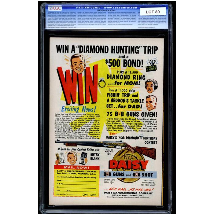 The Auctioneer has reserved the right to reject any and all bids, and to bid at the auction. Auctioneers Auctions are not on approval. Auctioneer does not allow certified material to be returned because of possible differences of opinion with respect to the grade offered by any third party organization, dealer, or service. Absolutely no guarantee of grade is offered for un-certified property sold and subsequently submitted to a third-party grading service. There will be no exceptions to this policy. Under extremely limited circumstances, (e.g. gross cataloging error) a purchaser, who did not bid from the floor, may request Auctioneer to evaluate voiding a sale; such request must be made in writing detailing the alleged gross error, and submission of the lot to the Auctioneer must be pre-approved by the Auctioneer. Bidder must notify Auctioneer in writing of such request within three (3) days of the non-floor bidder receipt of the lot. Any lot that is to be evaluated must be in our offices within 30 days after Auction. Grading does not qualify for this evaluation process nor do such complaints constitute a basis to challenge the authenticity of a lot. AFTER THAT 30-DAY PERIOD, NO LOTS MAY BE RETURNED FOR REASONS OTHER THAN AUTHENTICITY. Lots returned must be housed intact in the original holder. No lots purchased by floor Bidders may be returned (including those Bidders acting as agents for others). Late remittance for purchases may be considered just cause to revoke all return privileges. B: Auctions conducted solely on the Internet have a THREE (3) DAY RETURN POLICY: Lots paid for within seven days of the Auction closing are sold with a three (3) day return privilege. You may return lots under the following conditions: Within three days of receipt of the lot, you must first notify Auctioneer by contacting Client Service by phone (314-680-8599) or e-mail (moundcityauctions@gmail.com), and immediately mail the lot(s) fully insured to the attention of Returns, Mound City Auctions 1081 Teson Rd. Hazelwood, MO. 63042. Lots must be housed intact in their original holder and in their original condition. You are responsible for the insured, safe delivery of any lots. Auctioneer will not be responsible for lots returned in non-registered mail or lots returned without prior authorization per section B. A non-negotiable return fee of 5% of the purchase price ($10 per lot minimum) will be deducted from the refund for each returned lot or billed directly. Postage and handling fees are not refunded. After the three-day period (from receipt), no items may be returned for any reason. Late remittance for purchases revokes all Return-Restock privileges. C: Bidders who have inspected the lots prior to the auction will not be granted any return privileges. D: Comic books sold referencing a third-party grading service are sold “as is” without any express or implied warranty. Certain warranties may be available from the grading services and the Bidder is referred to them for further details: Certified Guaranty Company, LLC. (CGC), P.O. Box 4738, Sarasota, FL 34230. E: Bidders who intend to challenge authenticity or provenance of a lot must notify Auctioneer in writing within thirty (30) days of the Auctions conclusion. In the event Auctioneer cannot deliver the lot or subsequently it is established that the lot lacks title, provenance, authenticity, or other transfer or condition issue is claimed, Auctioneer's liability shall be limited to rescission of sale and refund of purchase price; in no case shall Auctioneer's maximum liability exceed the high bid on that lot, which bid shall be deemed for all purposes the value of the lot. After one year has elapsed, Auctioneer's maximum liability shall be limited to any commissions and fees Auctioneer earned on that lot. F: All comics are guaranteed genuine, but are not guaranteed as to grade, since grading is a matter of opinion, an art and not a science, and therefore the opinion rendered by the Auctioneer or any third party grading service may not agree with the opinion of others (including trained experts), and the same expert may not grade the same item with the same grade at two different times. G: Since we cannot examine encapsulated comics, they are sold “as is”without our grading opinion, and may not be returned for any reason. Auctioneer shall not be liable for any patent or latent defect or controversy pertaining to or arising from any encapsulated collectible. In any such instance, purchaser's remedy, if any, shall be solely against the service certifying the collectible. H: Due to changing grading standards over time, differing interpretations, and to possible mishandling of items by subsequent owners, Auctioneer reserves the right to grade items differently than shown on certificates from any grading service that accompany the items. Auctioneer also reserves the right to grade items differently than the grades shown in the prior catalog should such items be reconsigned to any future auction. I: Although consensus grading is employed by most grading services, it should be noted as aforesaid that grading is not an exact science. In fact, it is entirely possible that if a lot is broken out of a plastic holder and resubmitted to another grading service or even to the same service, the lot could come back with a different grade assigned. J: Certification does not guarantee protection against the normal risks associated with potentially volatile markets. The degree of liquidity for certified collectibles will vary according to general market conditions and the particular lot involved. For some lots there may be no active market at all at certain points in time."