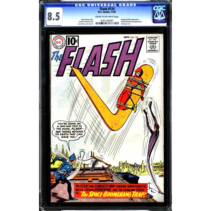 The Flash #124 CGC 8.5 cream to off-white pages. John Broome story Carmine Infantino and Joe Giella cover and art. Captain Boomerang appearance. Bondage cover. Overstreet 2009 VF 8.0 value = $148, VF/NM 9.0 value = $274. CGC census: 4 at 8.5, 5 higher.