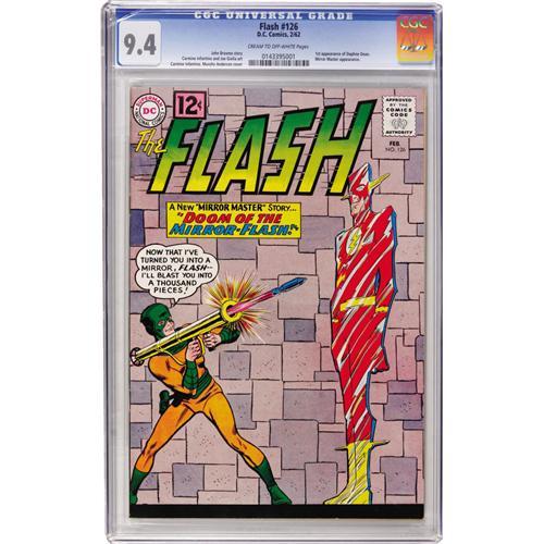 <B>The Flash #126 (DC, 1962) CGC NM 9.4 Cream to off-white pages.</B></I> The last time Heritage auctioned a 9.4 copy of this book, the winning bid was an eye-popping $4,182! Carmine Infantino drew the Scarlet Speedster's meeting with the Mirror Master. The issue has the first appearance of Barry Allen's old flame Daphne Dean, whom we'd see again in subsequent yarns. Overstreet 2006 NM- 9.2 value = $240. CGC census 3/07: 2 in 9.4, none higher.<BR><BR><b>Shipping:</b> Comics - Slabbed (certified) (<a target="_blank" href="http://www.heritageauctions.com/common/shipping.php">view shipping information</a>)