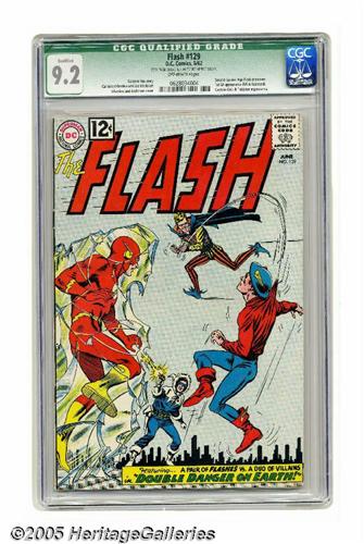 <B>The Flash #129 (DC, 1962) CGC Qualified NM- 9.2 Off-white pages.</B></I> Second Silver Age appearance of the Golden Age Flash. Justice Society cameo in a flashback. Captain Cold and the Trickster appear. Carmine Infantino art. CGC notes, "13th page detached, does not affect story." Overstreet 2005 GD 2.0 value = $29; VG 4.0 value = $58; FN 6.0 value = $87; VF 8.0 value = $210; VF/NM 9.0 value = $323; NM- 9.2 value = $435.