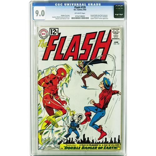 <B>The Flash #129 (DC, 1962) CGC VF/NM 9.0 Off-white pages.</B></I> The Golden Age Flash made his second Silver Age appearance here, and DC's creators <I>tantalized</B></I> Golden Age fans with a flashback to <B>All-Star Comics</B></I> #57. If that flashback counts as an appearance, these are the Silver Age debuts of the Earth-Two Green Lantern, Wonder Woman, Hawkman, Atom, Dr. Mid-Nite, and Black Canary. Meanwhile back in the present day, the two Flashes have to battle Captain Cold and the Trickster. Carmine Infantino drew all of the action. Overstreet 2006 VF/NM 9.0 value = $330; NM- 9.2 value = $450. CGC census 3/06: 8 in 9.0, 5 higher.