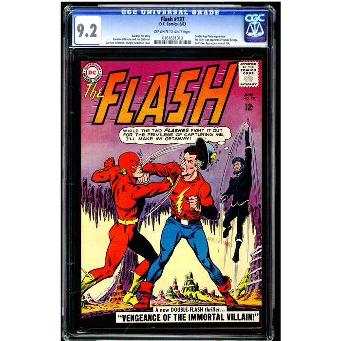 The Flash #137 CGC 9.2 off-white to white pages. Gardner Fox story, Carmine Infantino and Joe Giella art. Carmine Infantino and Murphy Anderson cover. Golden Age Flash appearance. 1st Silver Age appearance of Vandal Savage. 2nd Silver Age appearance of JSA. Overstreet 2009 NM 9.2 value = $800. CGC census: 4 at 9.2, 4 higher.