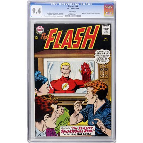 <B>The Flash #149 (DC, 1964) CGC NM 9.4 White pages.</B></I> Remember this story? Flash unmasks on TV to jog Kid Flash's memory and cure his amnesia, but he does it so quickly that only Kid Flash and his "super-fast vision" will see it... at least that's the plan! Carmine Infantino drew this issue's irresistible "hook" cover in addition to the accompanying story. Overstreet 2006 NM- 9.2 value = $150. CGC census 3/07: 5 in 9.4, 3 higher.<BR><BR><b>Shipping:</b> Comics - Slabbed (certified) (<a target="_blank" href="http://www.heritageauctions.com/common/shipping.php">view shipping information</a>)