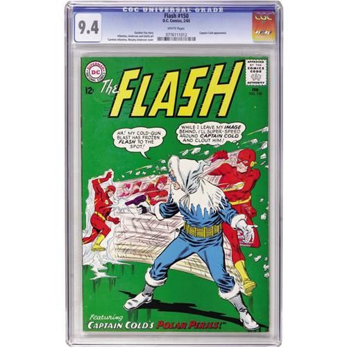 <B>The Flash #150 (DC, 1965) CGC NM 9.4 White pages.</B></I> Captain Cold appearance. Carmine Infantino and Murphy Anderson cover and art. Overstreet 2006 NM- 9.2 value = $150. CGC census 3/07: 4 in 9.4, 4 higher.<BR><BR><b>Shipping:</b> Comics - Slabbed (certified) (<a target="_blank" href="http://www.heritageauctions.com/common/shipping.php">view shipping information</a>)
