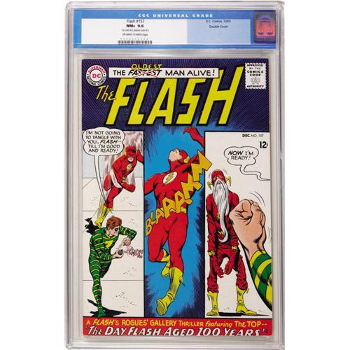 <B>The Flash #157 Double Cover (DC, 1965) CGC NM+ 9.6 Off-white to white pages.</B></I> Carmine Infantino produced this issue's cover co-starring the villainous Top. CGC notes, "1st cover 9.6, interior cover 9.6." Overstreet 2006 NM- 9.2 value = $125. CGC census 9/06: 3 in 9.6, none higher.<BR><BR><b>Shipping:</b> Slabbed Comic (<a target="_blank" href="http://www.heritageauctions.com/common/shipping.php">view shipping information</a>)