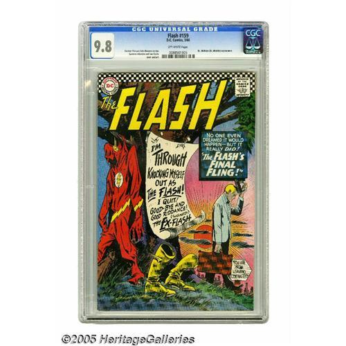 <B>The Flash #159 (DC, 1966) CGC NM/MT 9.8 Off-white pages.</B></I> The Flash calls it quits on this colorful cover -- will he really walk out on his superhero career? Golden Age character Dr. Mid-Nite makes a rare Silver Age appearance. Carmine Infantino and Joe Giella supply the art. This incredible copy will magically transport you back in time to 1966 -- have a nice trip! Overstreet 2005 NM- 9.2 value = $120. CGC census 8/05: 3 in 9.8, none higher. <BR><BR><B>Important notice:</B> Heritage usually auctions material at the rate of 200-250 lots per hour. On some occasions eBay Live bid software or the Internet may not be able to keep up with the pace of the auction. We recommend placing a realistic absentee bid now as insurance to avoid disappointment. Occasionally the auctioneer may eliminate or reject an eBay Live bid, and the auctioneer may also reopen a lot after the close of the eBay live bidding (usually because we missed an audience bid), and may reject your bid even if it shows you as the winning bidder. By bidding via eBay Live, you agree that Heritage may award the lot to another bidder at its sole discretion under the circumstances described above or any other reasonable circumstances. Since eBay bids are not shown to us until we open the lot on the floor, we treat those bids just like floor bids. In most cases the floor responds before the eBay bid is presented to us, due to Internet lag time, so for consistency we have made it a policy that floor bids are always considered first over tie eBay live bids. Also please note that all Heritage lots purchased through eBay Live carry a 20% Buyer's Premium. Please make sure you read the Terms and Conditions before you bid. This lot is being auctioned in conjunction with a live floor auction by Heritage Galleries & Auctioneers. All final auction and invoice information will be supplied by Heritage Galleries & Auctioneers, and all other information should be considered preliminary. Lot:1243 <BR><BR><B>Winning No
