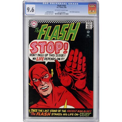<B>The Flash #163 (DC, 1966) CGC NM+ 9.6 Off-white to white pages.</B></I> We've seen the other 9.6 copy (which has the same page quality as this one), and while we'd dearly love either gem, the corners of this one are a bit sharper, the whites a bit whiter, so we'd go so far as to say this specimen would be an upgrade for <I>any</B></I> Flash collector. DC was known for coming up with covers first and writing stories to match them, and we've heard that John Broome penned this yarn to go with Carmine Infantino's striking cover. Overstreet 2006 NM- 9.2 value = $105. CGC census 3/07: 2 in 9.6, none higher.<BR><BR><b>Shipping:</b> Comics - Slabbed (certified) (<a target="_blank" href="http://www.heritageauctions.com/common/shipping.php">view shipping information</a>)