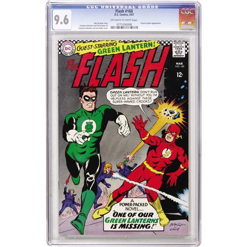 <B>The Flash #168 (DC, 1967) CGC NM+ 9.6 Off-white to white pages.</B></I> Green Lantern guest-stars in this Carmine Infantino-drawn issue. Overstreet 2006 NM- 9.2 value = $105. CGC census 3/07: 5 in 9.6, none higher.<BR><BR><b>Shipping:</b> Comics - Slabbed (certified) (<a target="_blank" href="http://www.heritageauctions.com/common/shipping.php">view shipping information</a>)